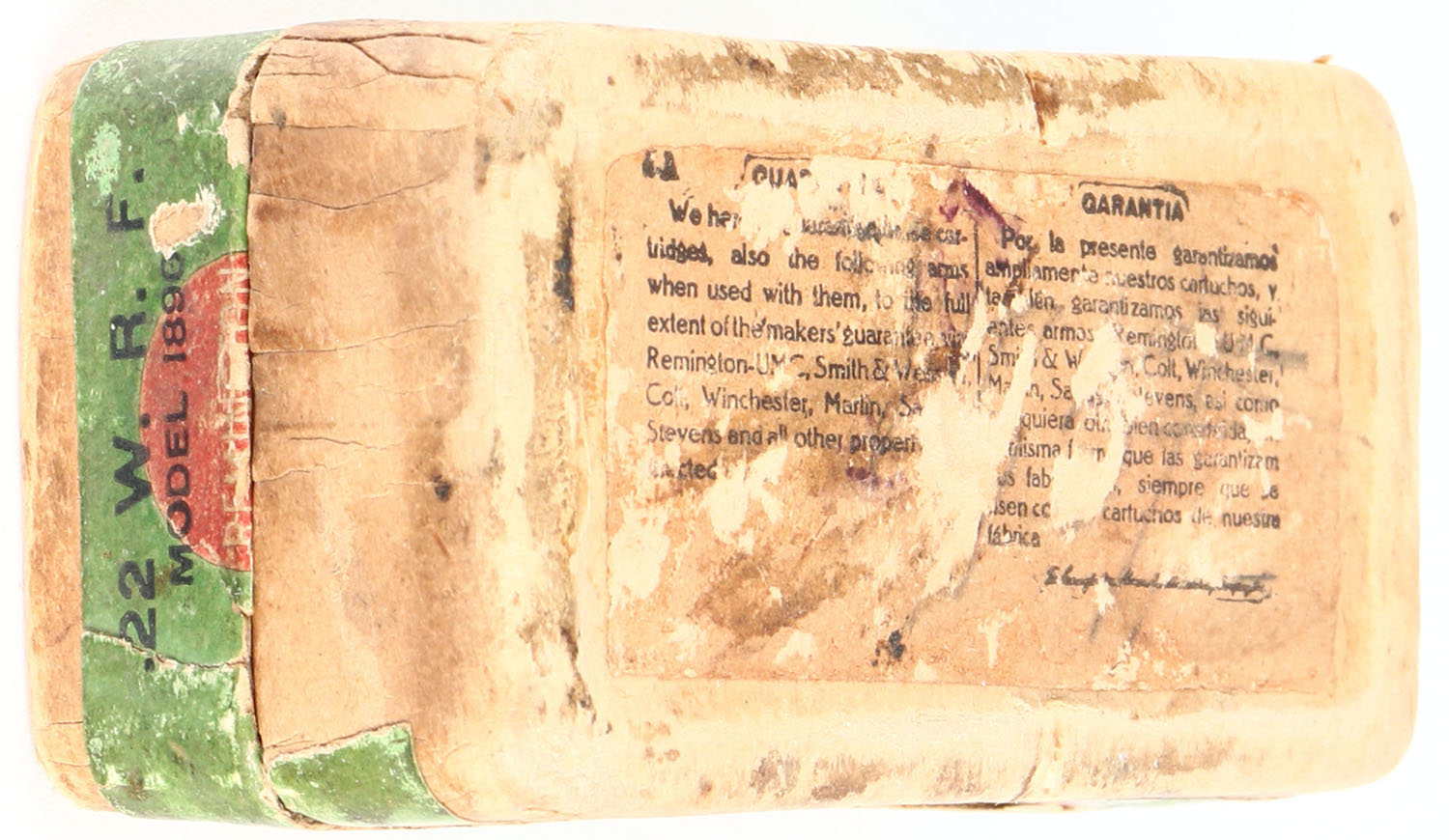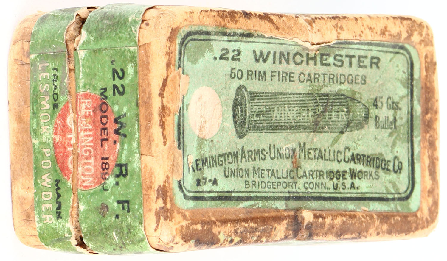 REM-UMC, .22 Winchester Rim Fire, Lesmok Powder, RHWeb: REM-2 WRF-1B, Full, 2pc. Buff box with green top & side sealing labels, box is solid with good color, age soiling, shelf wear, some edge & corner wear, labels are intact, ammo is excellent. Grade: Good ++ - Value: 20 to 100