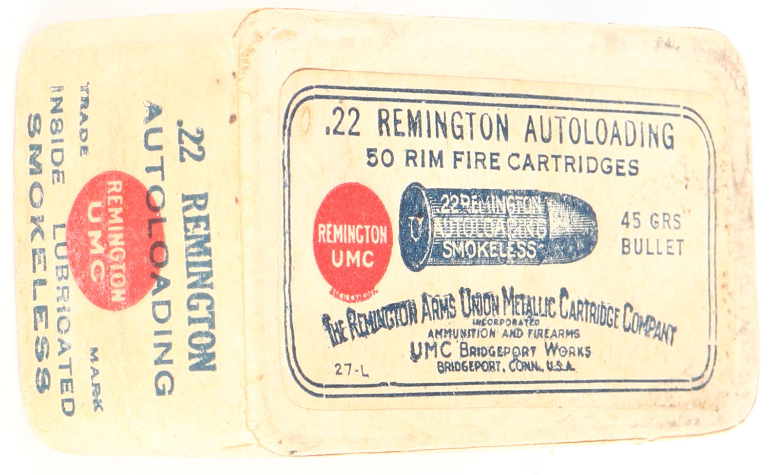 REM-UMC, .22 Remington Autoloading, Smokeless, RHWeb: REM-3 RA-1C, FULL & SEALED, 2pc. Buff box with buff top & side sealing labels, box is solid with very good to excellent color, some age soiling, minor edge & corner wear, labels are intact. Grade: Excellent - Value: 100 to 400