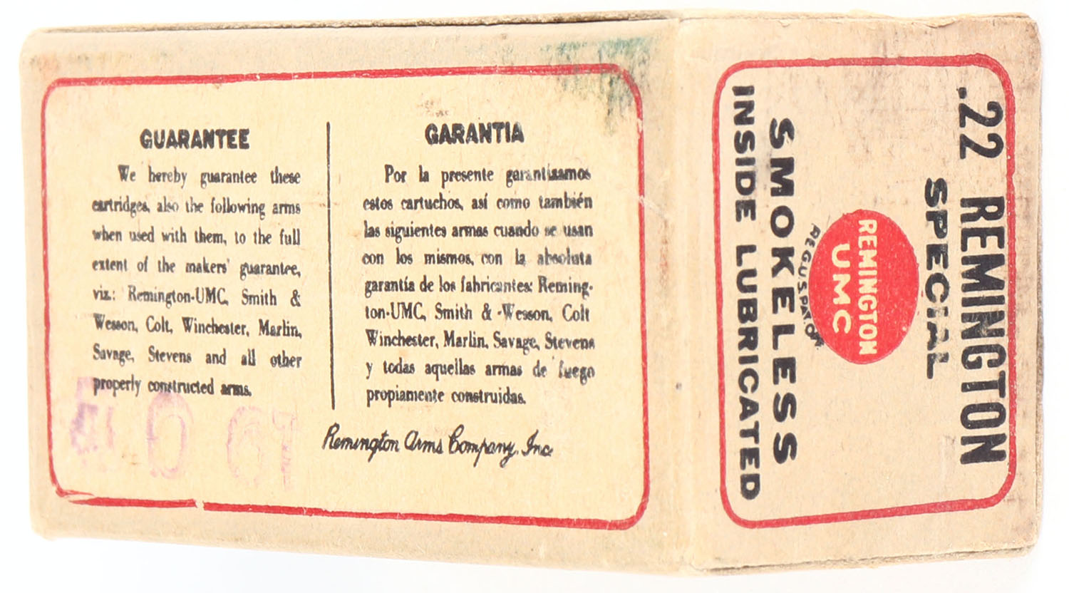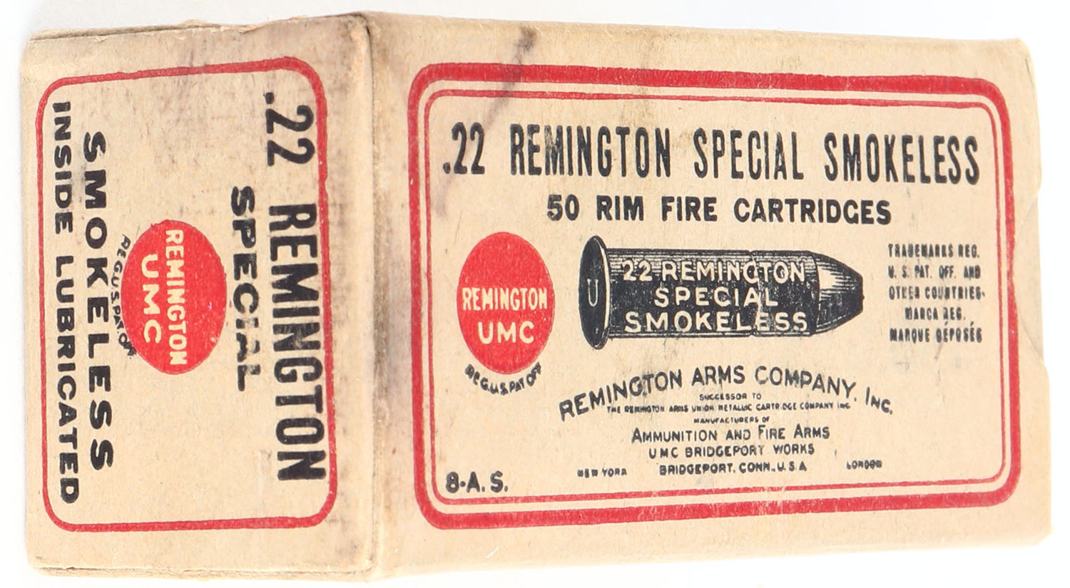 REM-UMC, .22 Remington Special, Smokeless, RHWeb: REM-5 RS-1A, Full, 1pc. Buff black & red box, box is solid with excellent color, some scuffing on top, very minor corner wear, edges are mostly crisp, end flaps are solid, ammo is excellent. Grade: Excellent + - Value: 50 to 200