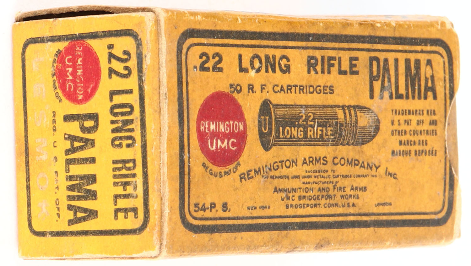 REM-UMC, Palma, .22 Long Rifle, RHWeb: REM-52 LR-1b, Full, 1pc. Orange box, box is solid with good to very good color, age soiling, very minor corner wear, edges are mostly crisp, end flaps are solid, ammo is very good. Grade: Very Good ++ - Value: 20 to 80