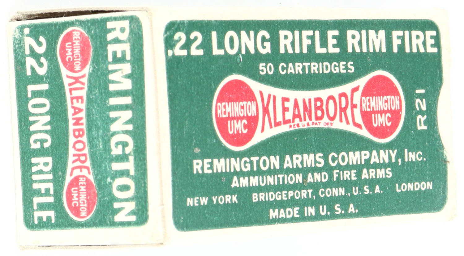 Remington, Kleanbore, .22 Long Rifle, R21, RHWeb: REM-7.1B LR-1c, Full, 1pc. Green white & red dogbone box, box is near mint with minty color, only has very minor corner wear, edges are crisp, end flaps are solid, ammo is excellent. Grade: Excellent ++ - Value: 10 to 50