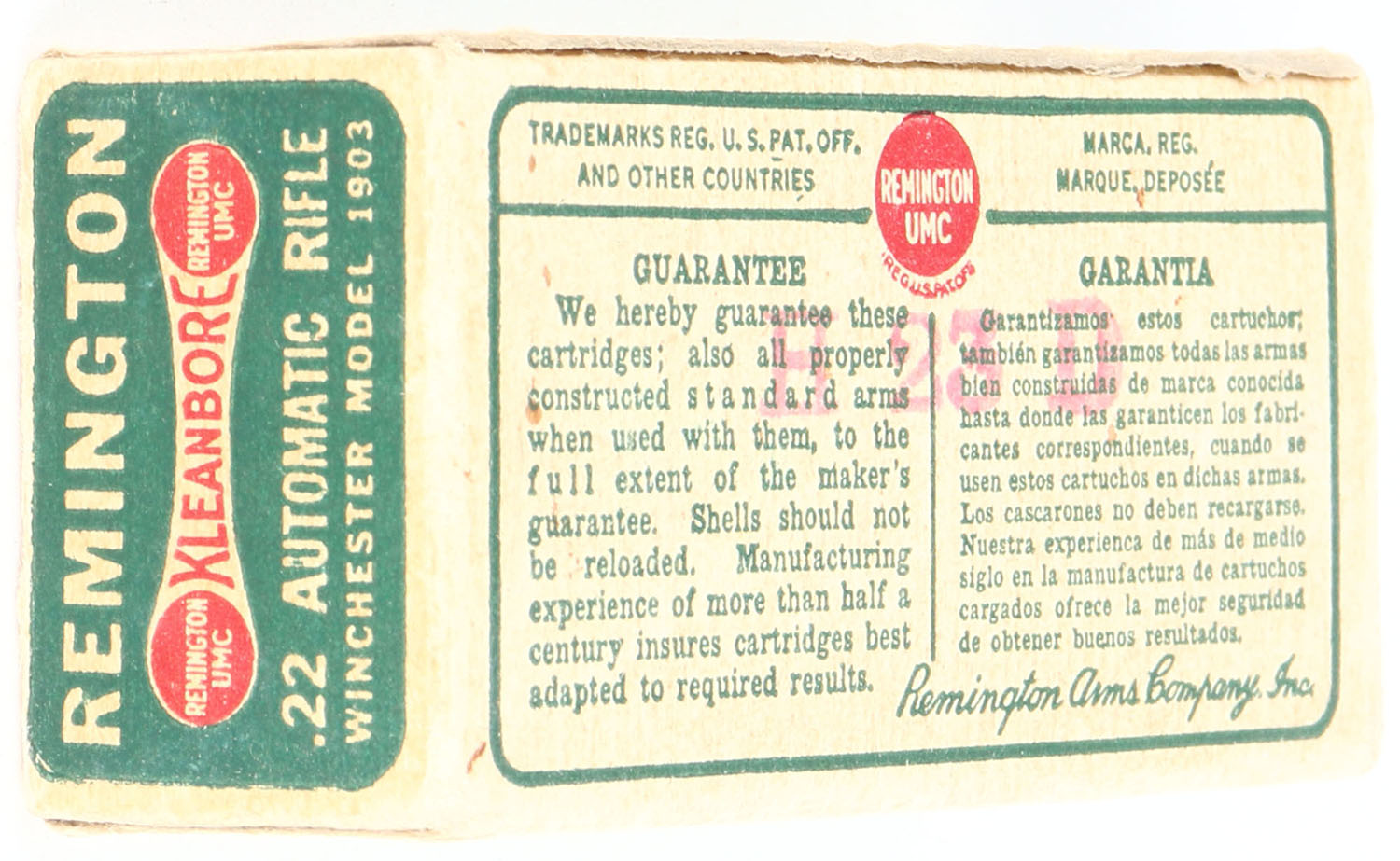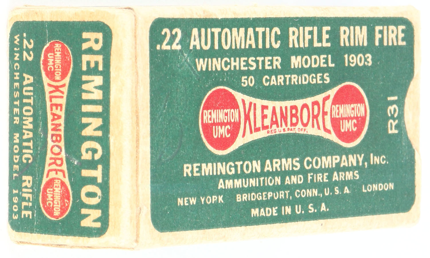 Remington, Kleanbore, .22 Winchester Automatic, RHWeb: REM-7.1B WA-1d, Full, 1pc. Green white & red dogbone box, box is solid with excellent color, minor age soiling, very minor corner wear, edges are mostly crisp, end flaps are solid, ammo is excellent. Grade: Excellent + - Value: 20 to 60
