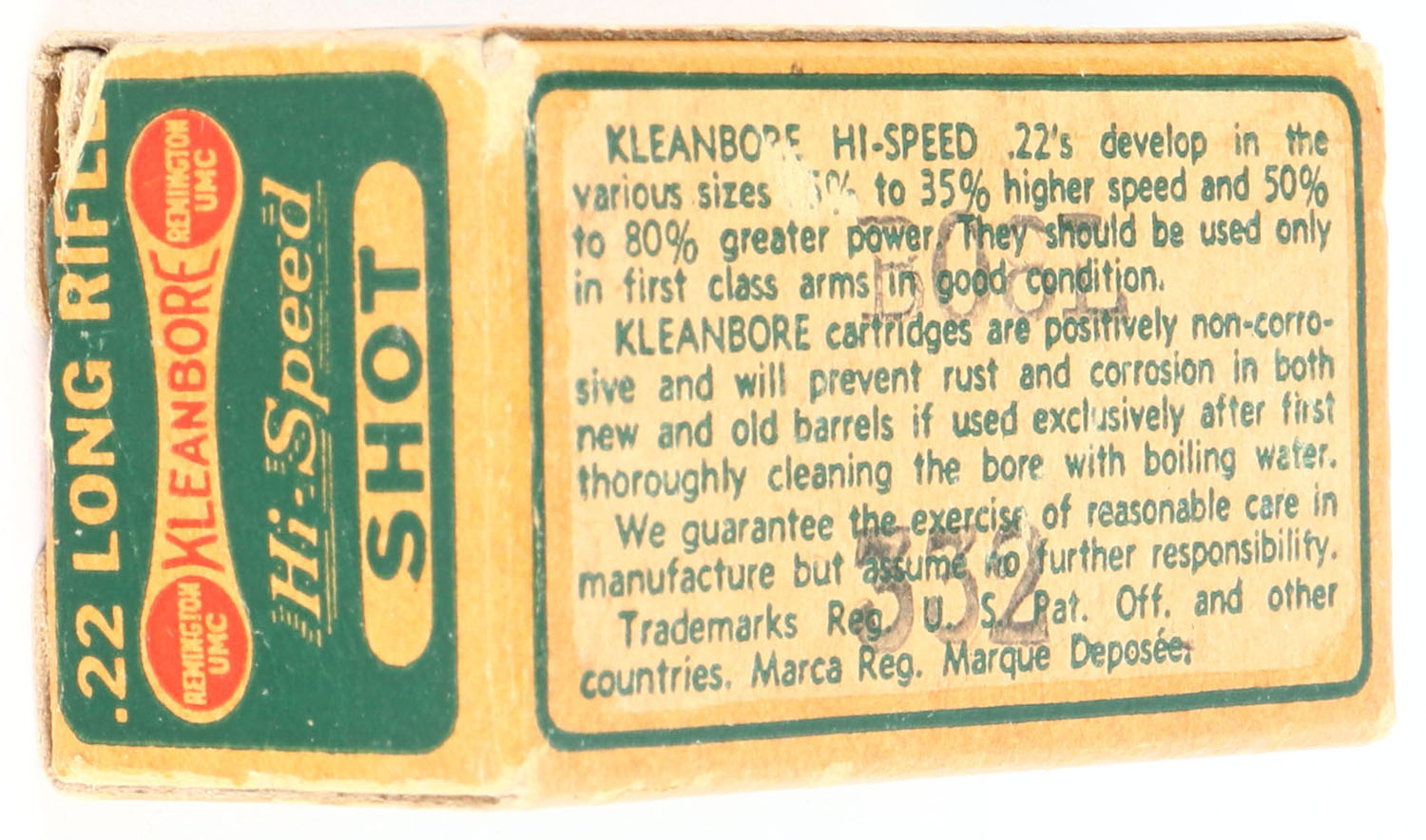 Remington, Kleanbore Hi-Speed, .22 Long Rifle Shot, R24H RHWeb: REM-7.4 LR-4c, Full, 1pc. Green buff & red box, box is solid with excellent color, minor age soiling & corner wear, edges are mostly crisp, small tear to right end flap, end flaps are solid, ammo is excellent. Grade: Excellent - Value: 10 to 50