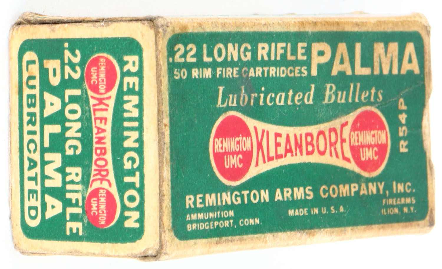 Remington, Kleanbore Palma, .22 Long Rifle, RHWeb: REM-52 LR-88c, Full, 1pc. Green buff & red dogbone box, box is solid with very good color, age soiling, some corner wear, edges are mostly crisp, end flaps are solid, ammo is excellent. Grade: Very Good + - Value: 8 to 40