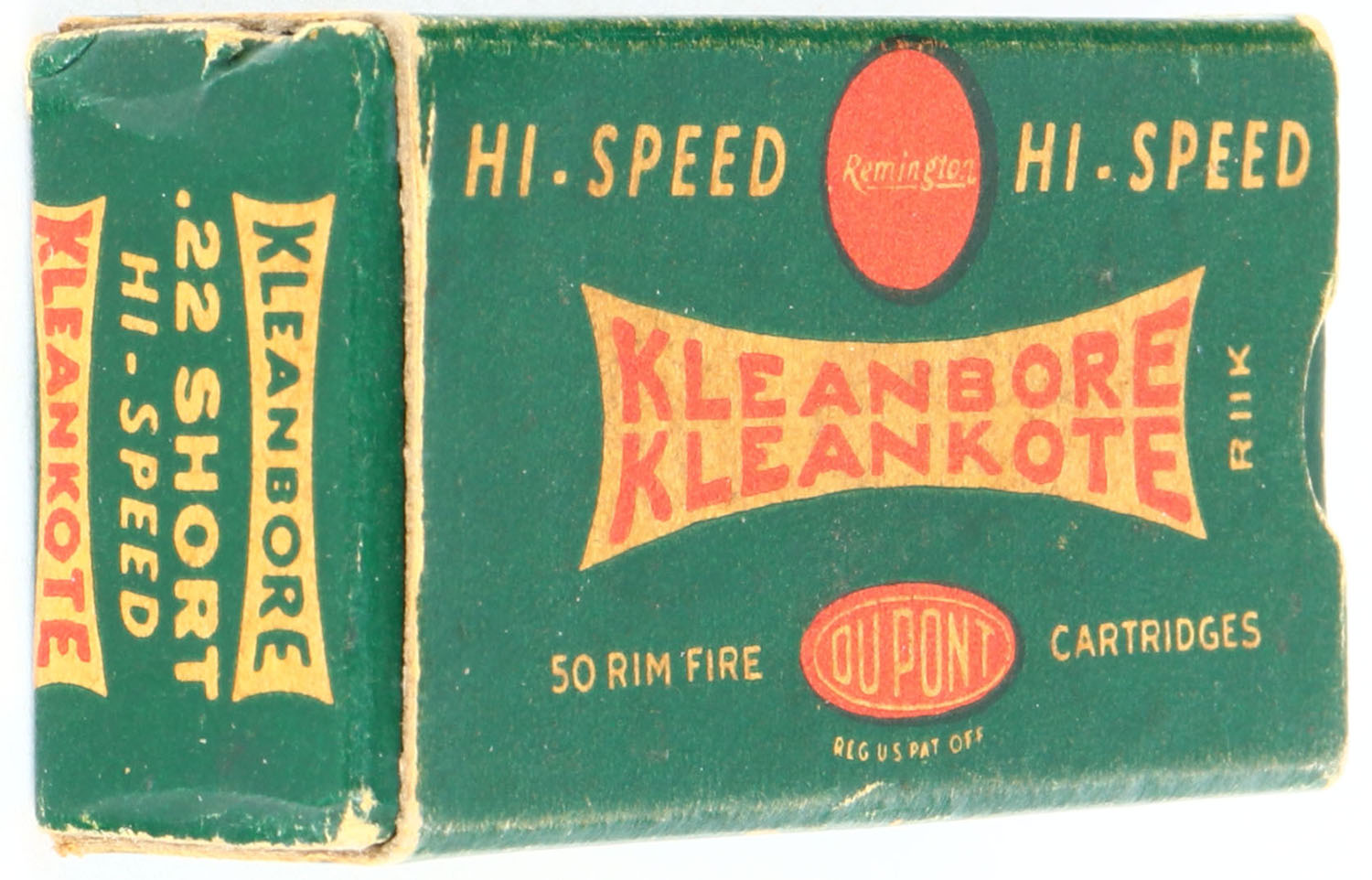Remington, Kleanbore Kleankote, .22 Short, Hi-Speed, RHWeb: REM-9 S-1b, Full, 1pc. Green white & red box, box is solid with very good color, some age soiling, minor edge & corner wear, end flaps are solid, ammo is excellent. Grade: Very Good ++ - Value: 10 to 40