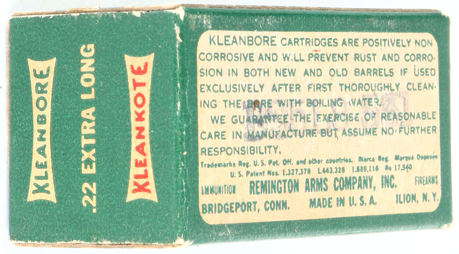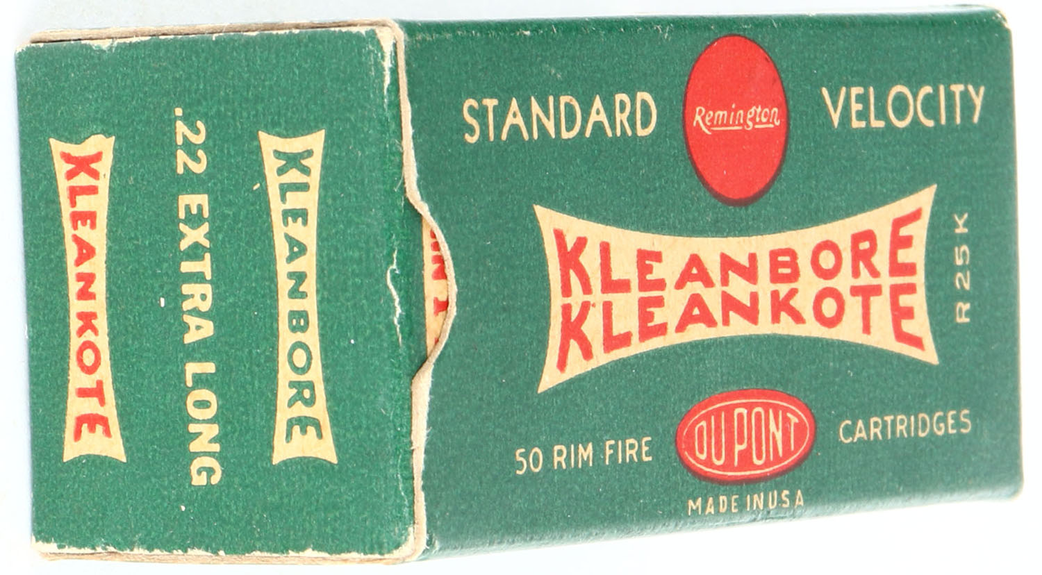 Remington, Kleanbore Kleankote, .22 Extra Long, Standard Velocity, RHWeb: REM-9 XL-1c, Full, 1pc. Green white & red box, box is solid with excellent color, minor age soiling, very minor corner wear, edges are crisp, end flaps are solid, ammo is excellent. Grade: Excellent + - Value: 100 to 300