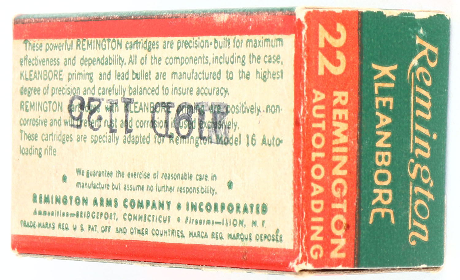 Remington, Kleanbore, .22 Remington Autoloading, 7422, RHWeb: REM-12 RA-1b, Full, 1pc. Greed white & red box, box is solid with excellent color, very minor age soiling & corner wear, edges are crisp, end flaps are solid, ammo is excellent to minty. Grade: Excellent + - Value: 50 to 150