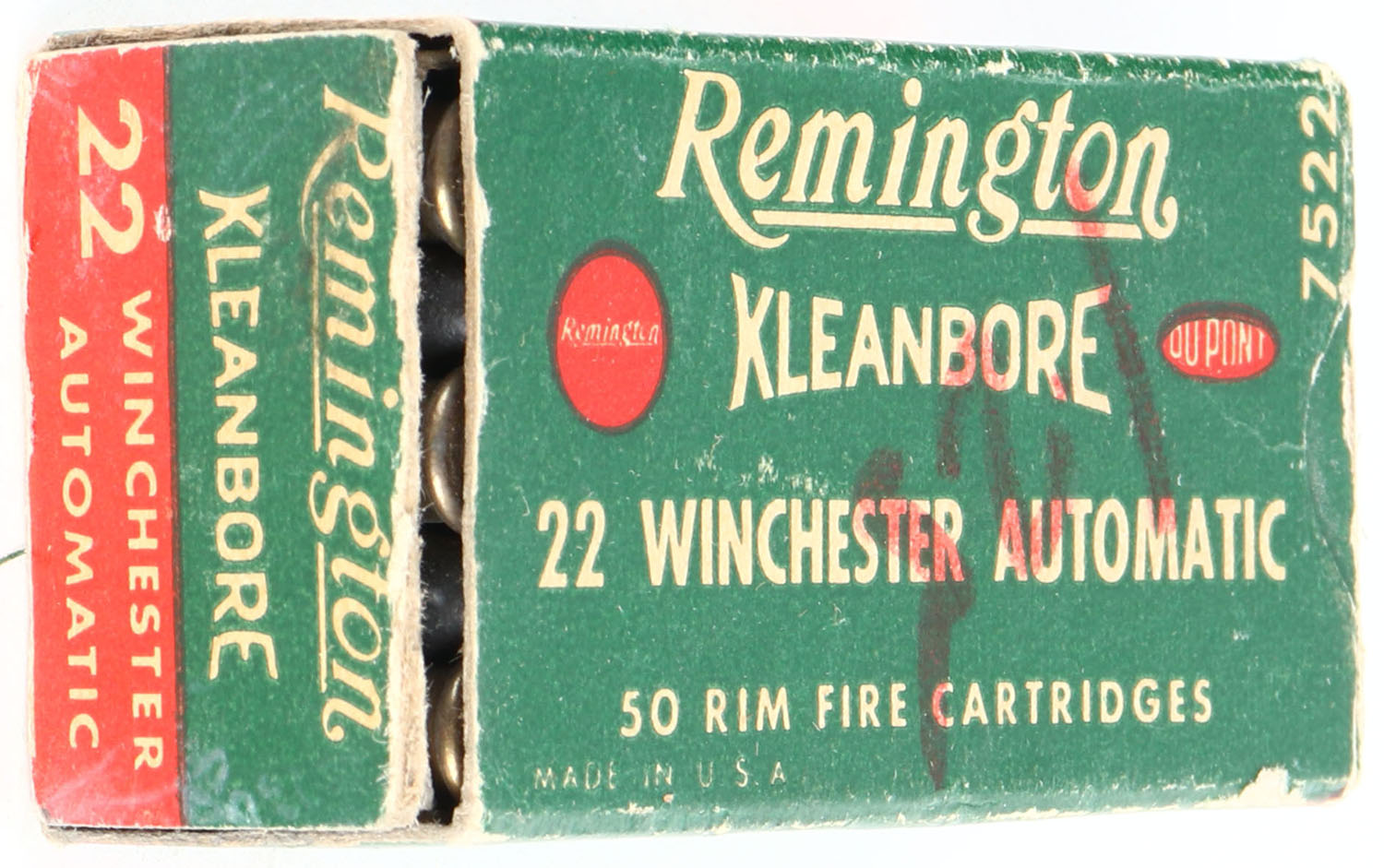Remington, Kleanbore, .22 Winchester Automatic, 7522, RHWeb: REM-12 WA-1b, Full, 1pc. Green white & red box, box is solid with very good color, some age soiling, partial seam split to left end flap tab, some edge & corner wear, top has been written on, ammo is excellent. Grade: Very Good - Value: 20 to 80