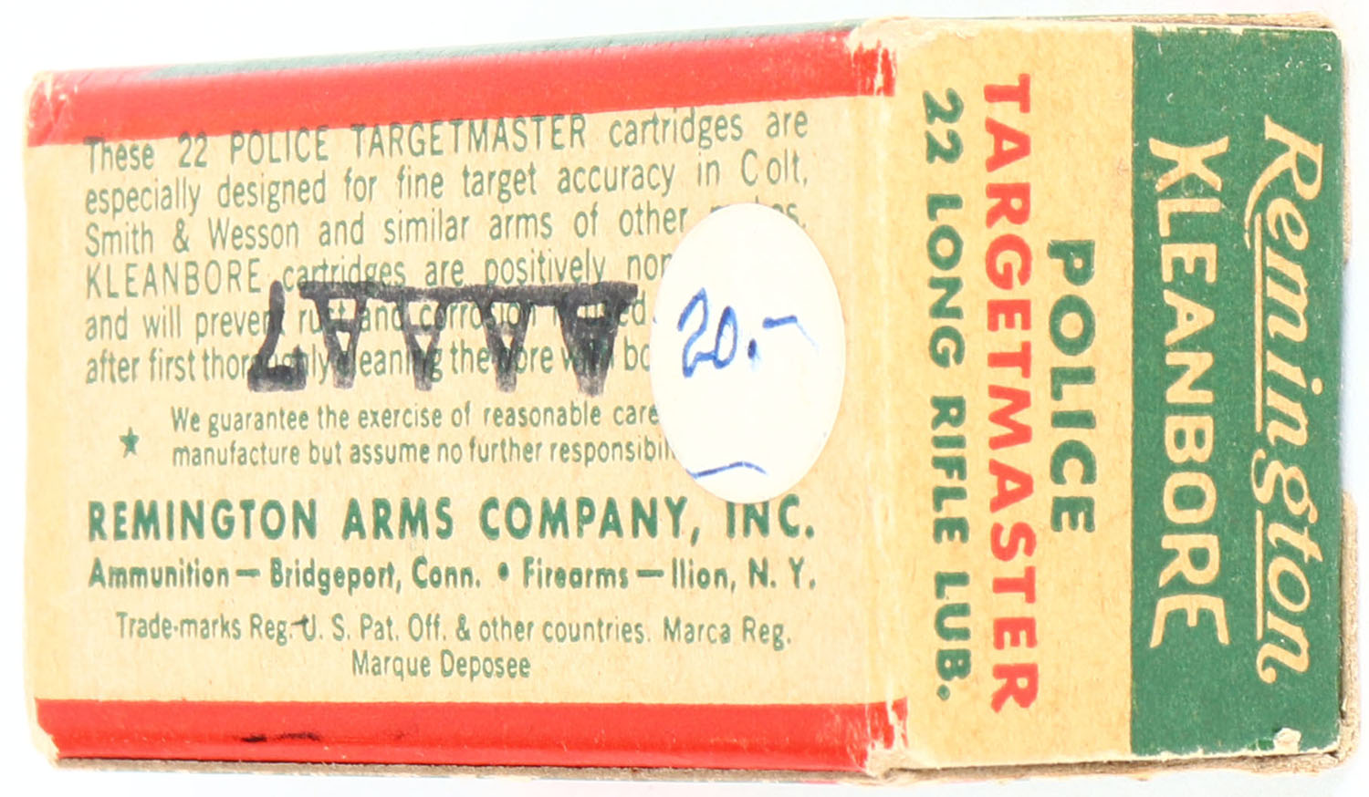 Remington, Police TargetMaster, .22 Long Rifle, Kleanbore, RHWeb: REM-69 LR-2d, Full, 1pc. Green white & red box, box is solid with excellent color, minor age soiling & corner wear, very minor edge wear, end flaps are solid, ammo is excellent. Grade: Excellent - Value: 10 to 40