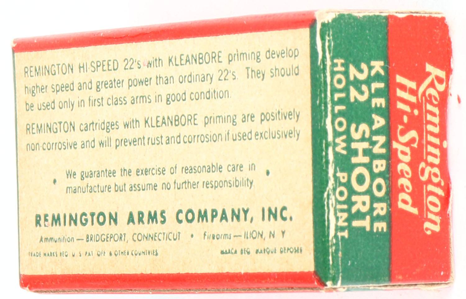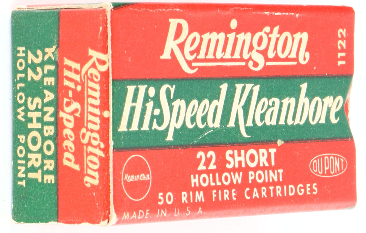 Remington, Hi-Speed Kleanbore, .22 Short Hollow Point, 1122, RHWeb: REM-14 S-2a, Full, 1pc. Red white & green box, box is solid with excellent color, very minor corner wear, edges are mostly crisp, end flaps are solid, ammo is minty. Grade: Excellent - Value: 10 to 50