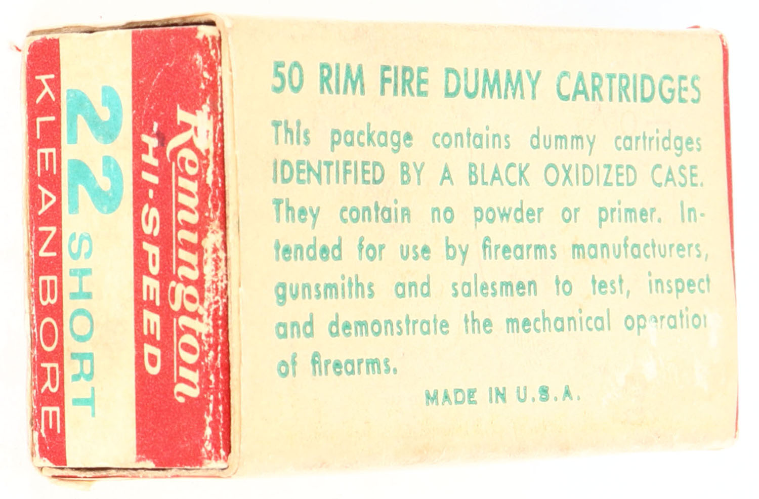 Remington, Hi-Speed, .22 Short Dummy Cartridges, RHWeb: REM-17 S-5, Full, 1pc. Red white & green box with white wraparound label, box is solid with very good color, some age soiling & corner wear, edges are mostly crisp, end flaps are solid, ammo is excellent. Grade: Very Good ++ - Value: 8 to 40