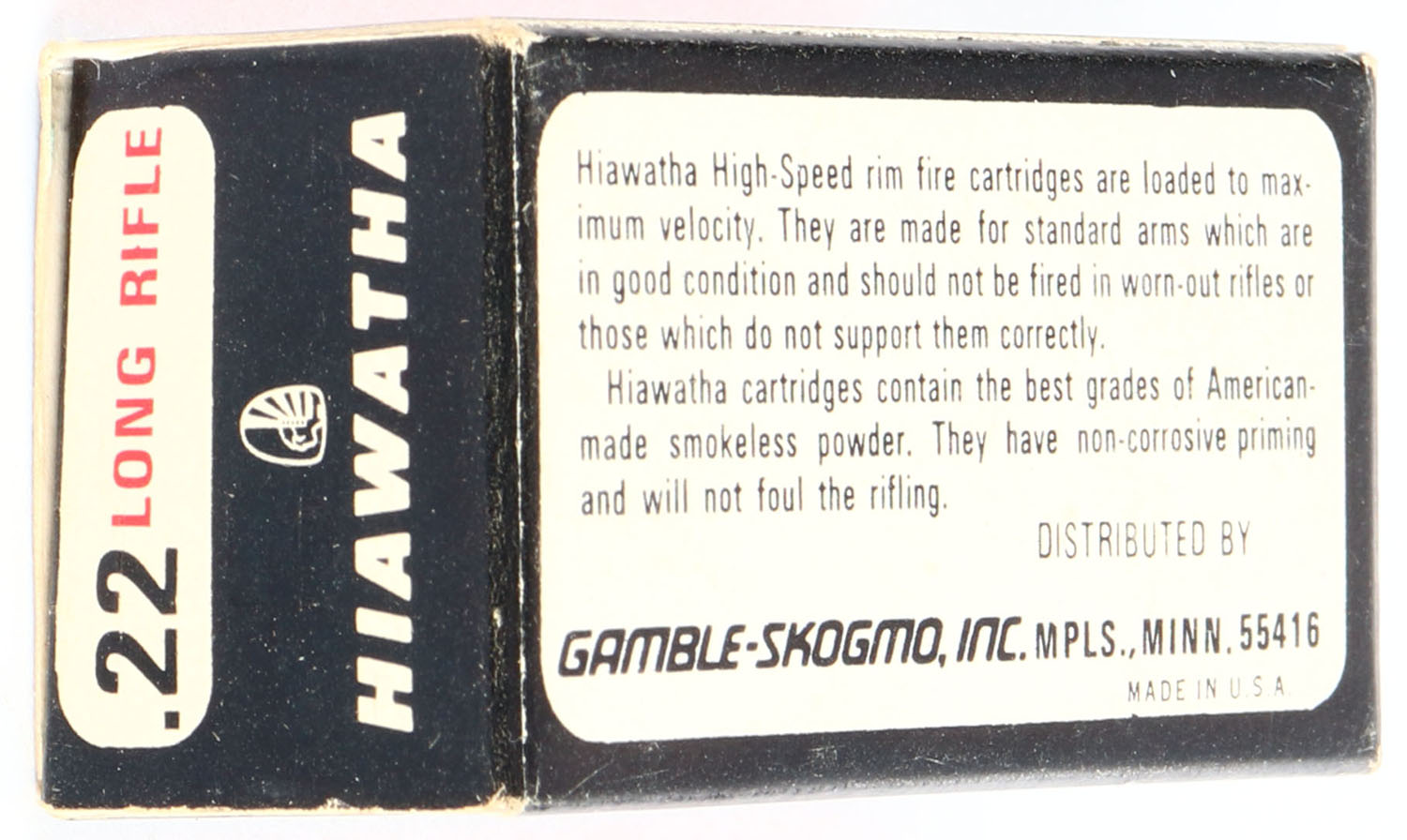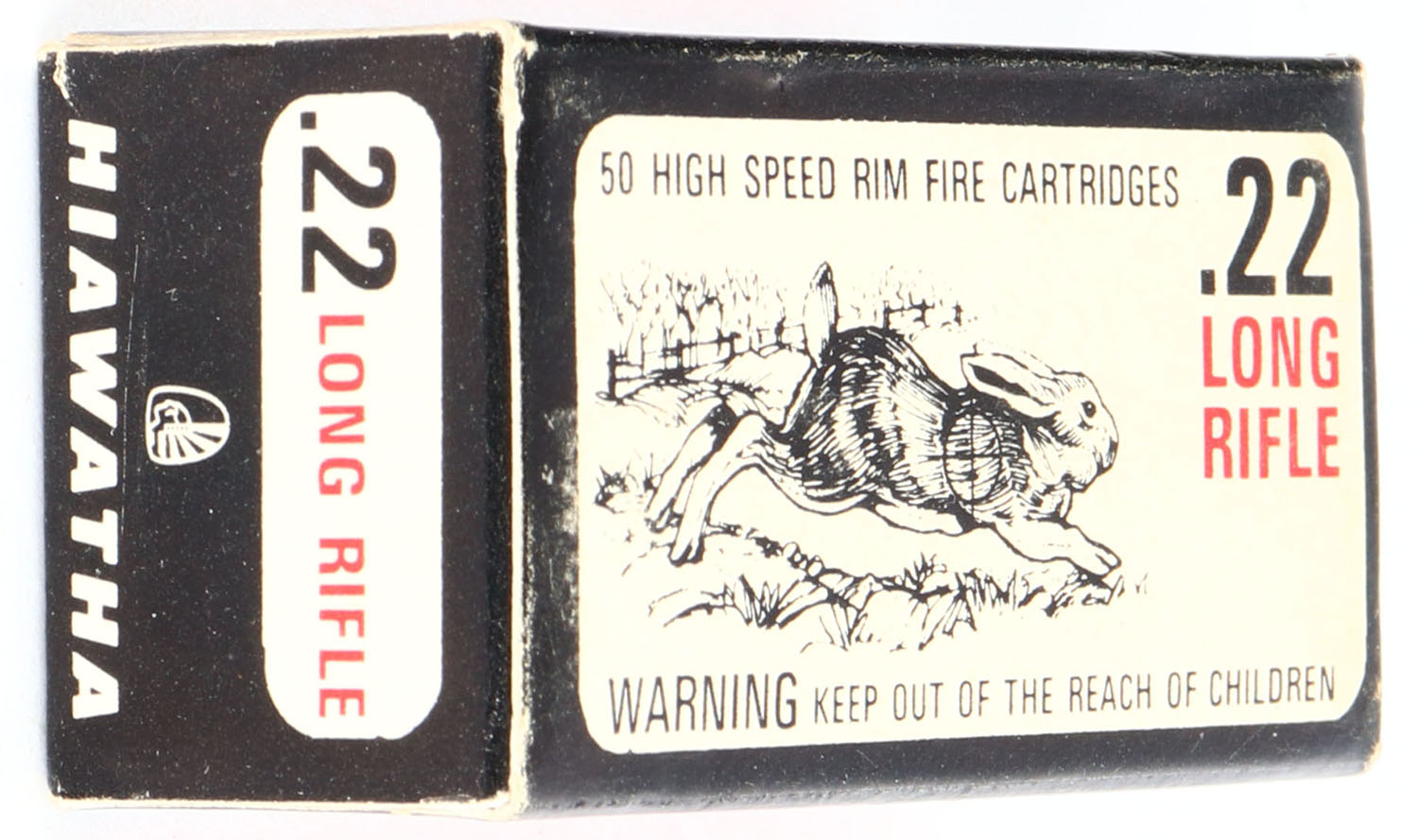 Gambles, Hiawatha, .22 Long Rifle, High Speed, RHWeb: GS-5 LR-1a, Full, 1pc. White black & red rabbit box, box is solid with excellent color, very minor age soiling & corner wear, edges are crisp, end flaps are solid, ammo is excellent. Grade: Excellent ++ - Value: 20 to 60