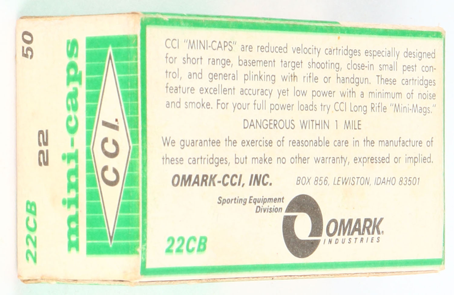 CCi, mini-caps, .22 C.B. Caps, RHWeb: CCI-3 CB-1b, Full, 1pc. Green & white box, box is solid with very good to excellent color, minor age soiling, very minor corner wear, edges are crisp, end flaps are solid, ammo is excellent to minty. Grade: Excellent - Value: 10 to 50