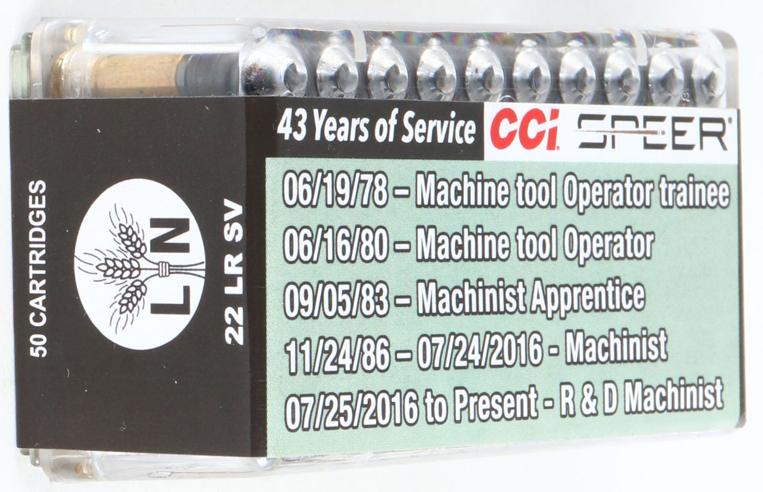 CCi, Larry Norton Retirement Commemorative box, .22 Long Rifle, Standard Velocity, FULL & SEALED, 2pc. Clear plastic tray with multi-colored sealing label featuring a combine harvesting in a field, box is MINT with mint color, label is mint, ammo appears mint. Grade: MINT - Value: 50 to 150