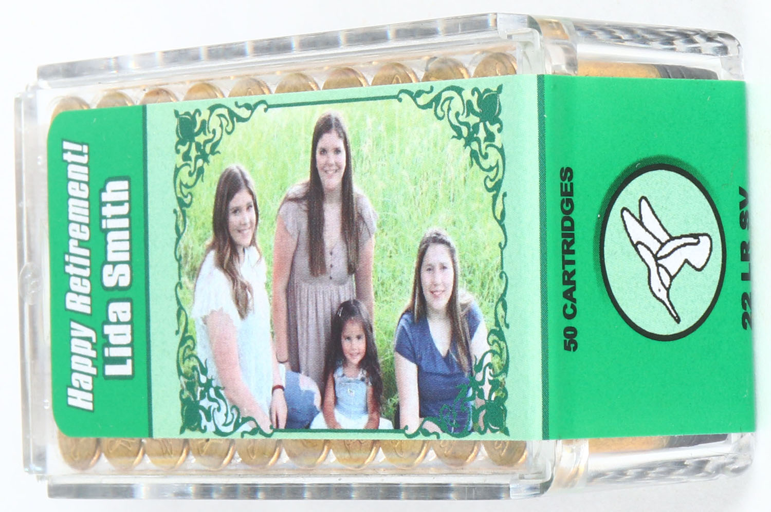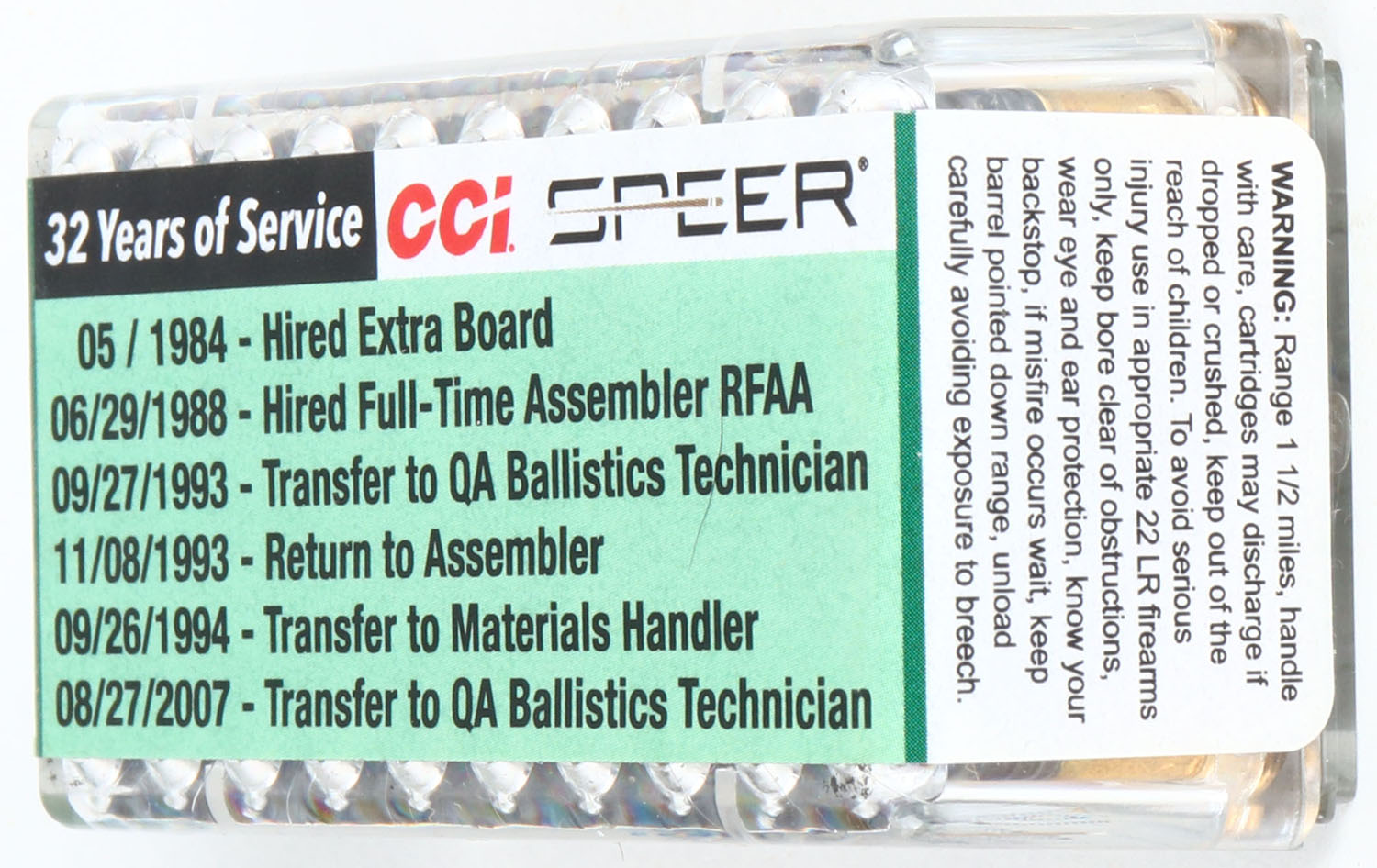 CCi, Lida Smith Retirement Commemorative box, .22 Long Rifle, Standard Velocity, FULL & SEALED, 2pc. Clear plastic tray with green sealing label that features the Smith Family, box is MINT with mint color, label is mint, ammo appears mint. Grade: MINT - Value: 50 to 150