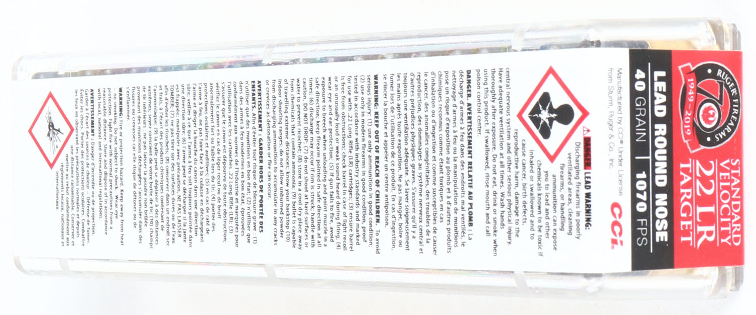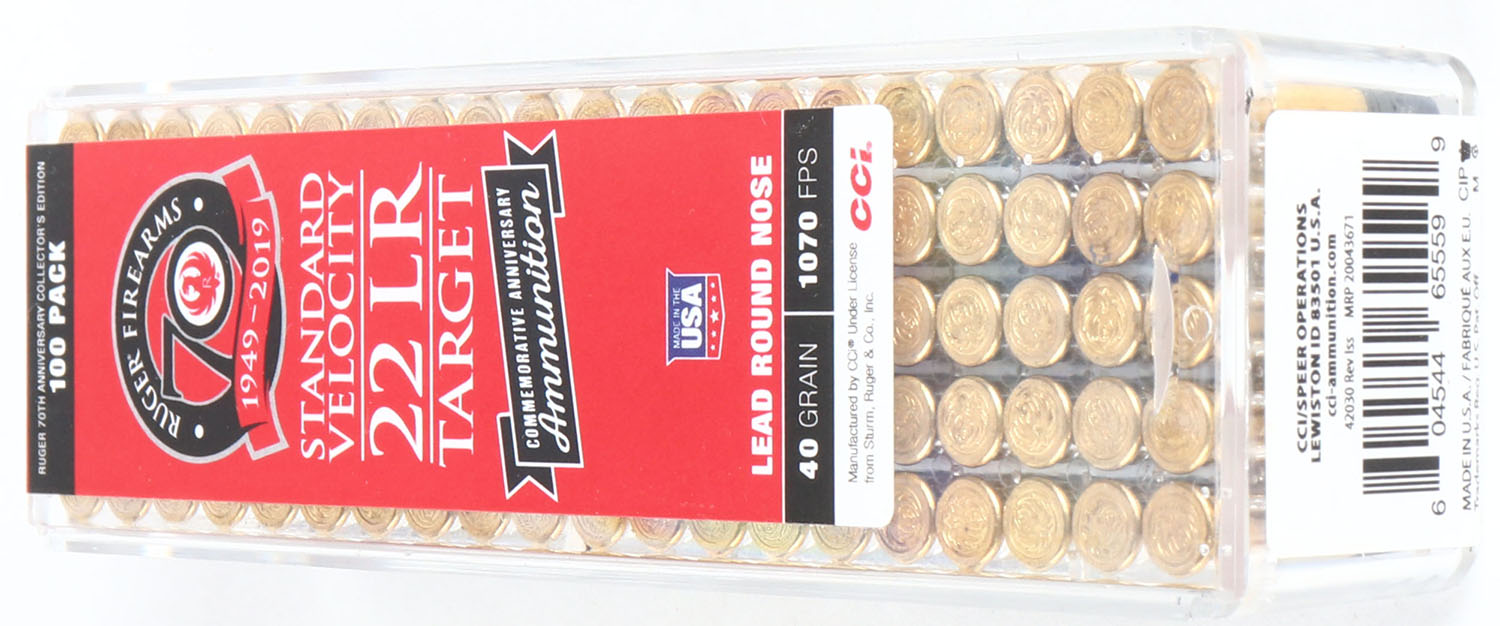 CCi, Ruger 70th anniversary commemorative, .22 Long Rifle, Standard Velocity, Not in RHWeb, Full & Sealed, 2pc. Clear plastic tray with red & black label, box is MINT, label is mint, ammo appears mint. Grade: MINT - Value: 10 to 50