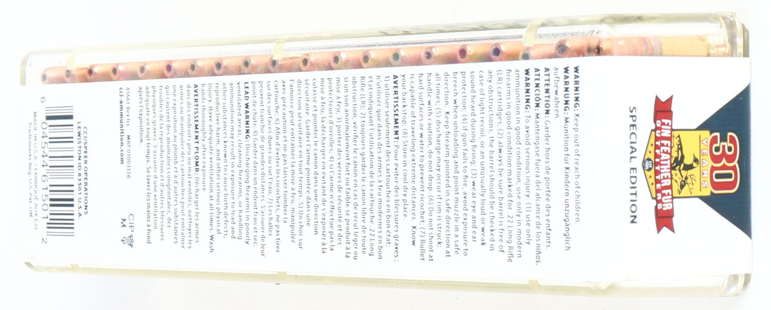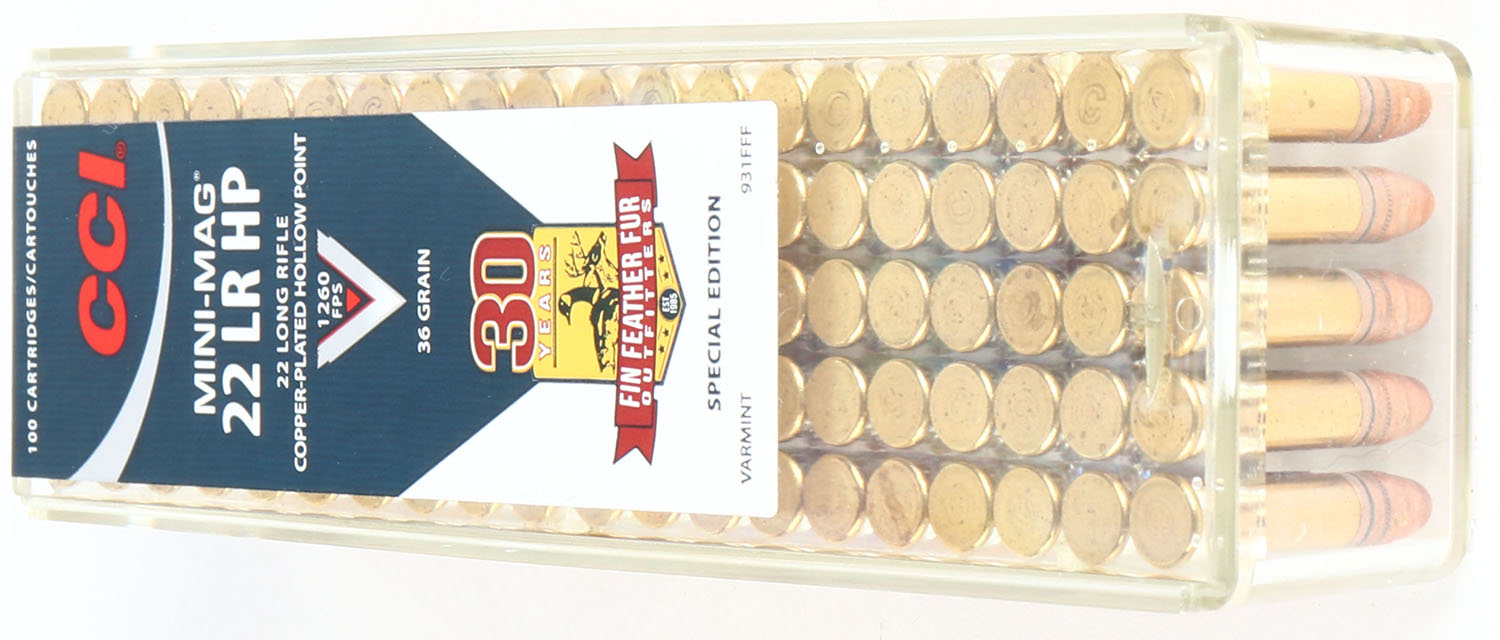 CCi, Mini-Mag, .22 Long Rifle Hollow Point, Special Edition - 30 Years Fin Feather Fur Outfitters, Full & Sealed, 2pc. Clear plastic tray with blue & white label featuring FFF crest, tray is clean & clear, label is intact with minty color. Grade: MINT - Value: 10 to 50