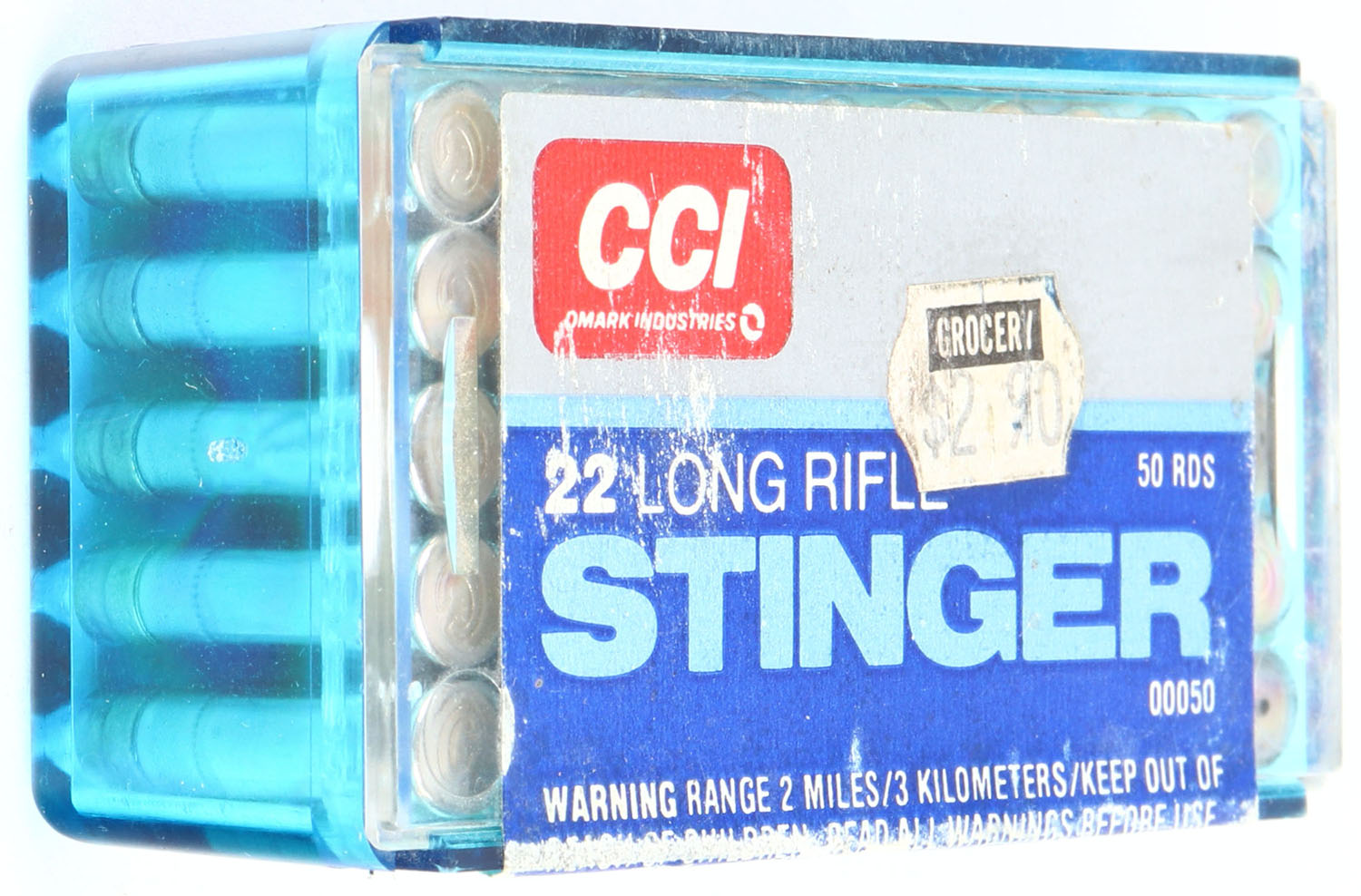 CCi, Stinger, 22 Long Rifle, Hyper-Velocity, RHWeb: CCI-11 LR-7 FULL & SEALED 2pc. Blue plastic tray with blue & gray sealing label, box is solid, label has excellent color, some shelf wear, original retail price tag, label is intact, ammo appears minty. Grade: Very Good ++ - Value: 8 to 40