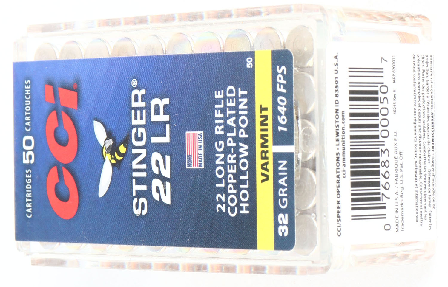 CCi, Stinger, .22 Long Rifle Stinger, FULL & SEALED, 2pc. Clear plastic tray with multi-colored sealing label, box and label are MINT with mint color, ammo appears mint. Grade: MINT - Value: 8 to 40