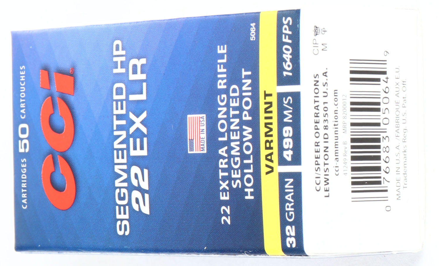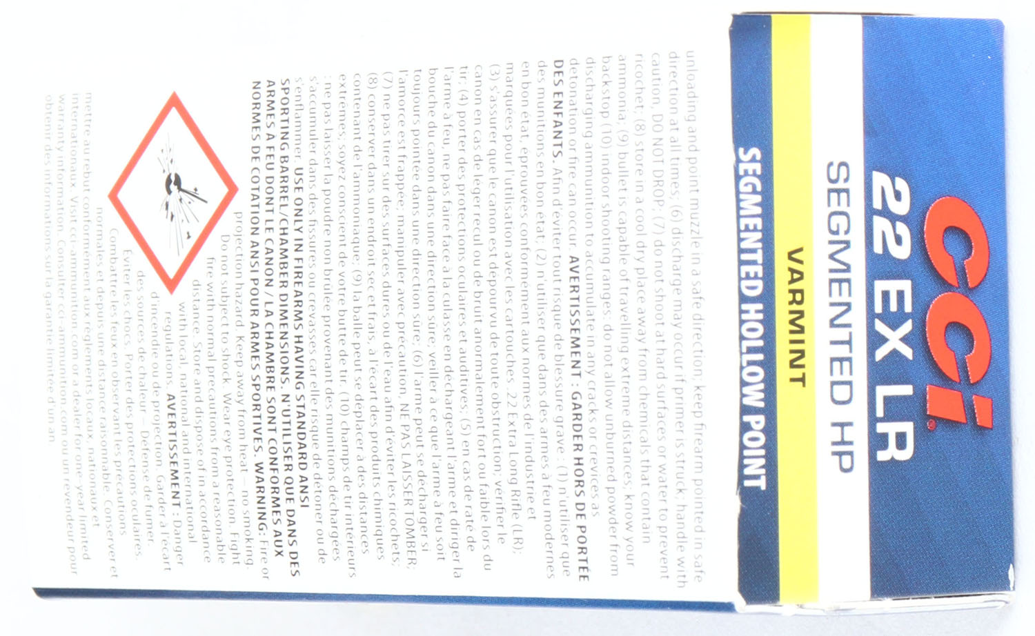 CCi, Varmint, .22 Extra Long Rifle, Segmented Hollow Point, 1pc. Full, 50rds. Blue box, box is MINT with minty color, sharp corners, crisp edges, rigid end flaps, ammo is mint. Grade: MINT - Value: 30 to 90