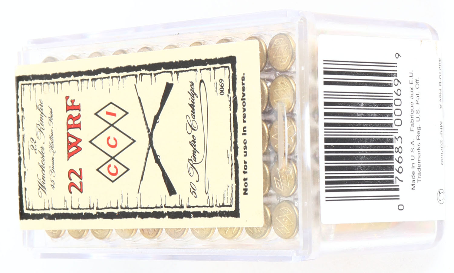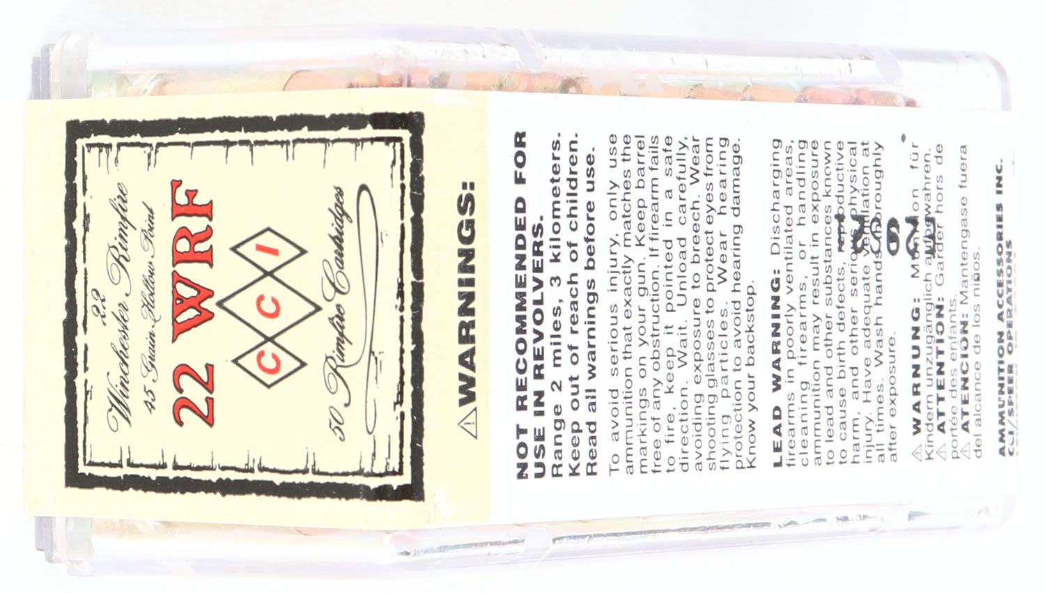 CCi, .22 WRF Hollow Point, FULL & SEALED, 2pc. Clear plastic tray with tan sealing label, box and label are mint, ammo appears minty. Grade: MINT - Value: 16 to 32