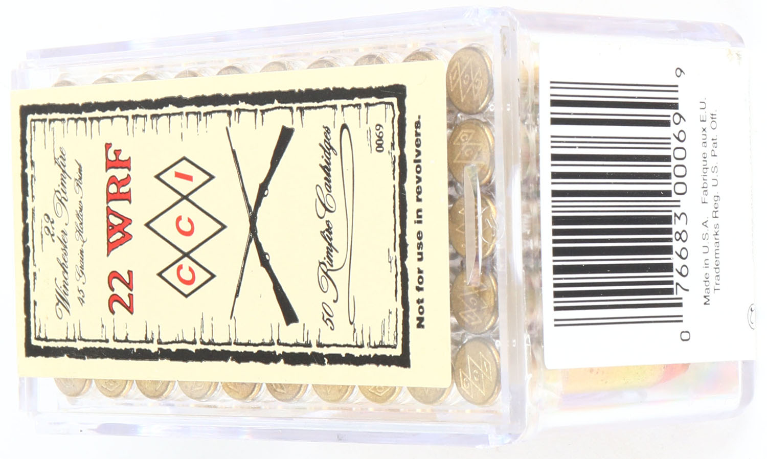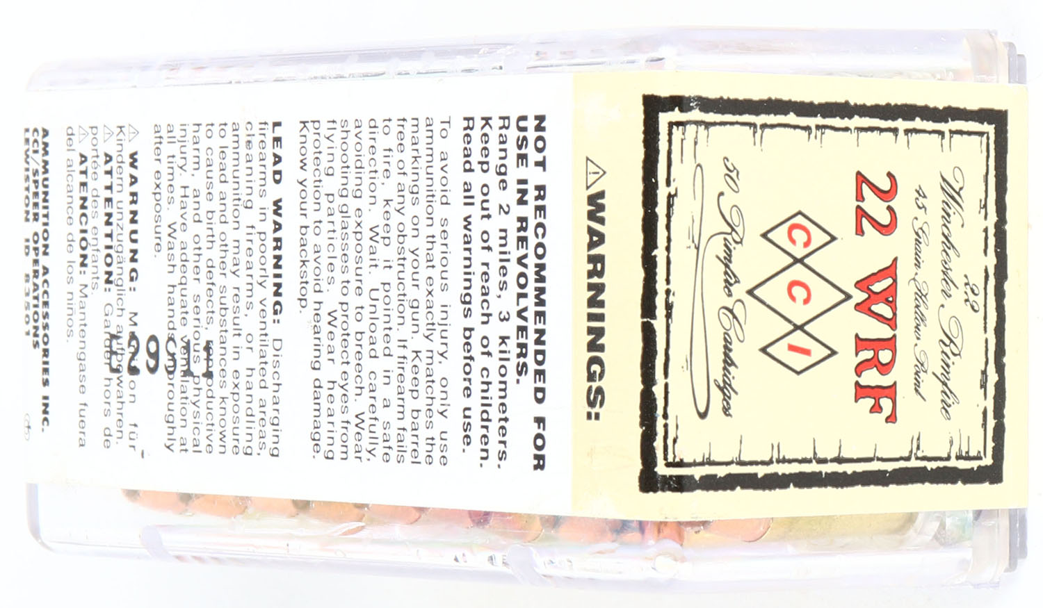 CCi, .22 WRF Hollow Point, FULL & SEALED, 2pc. Clear plastic tray with tan sealing label, box and label are mint, ammo appears minty. Grade: MINT - Value: 16 to 32