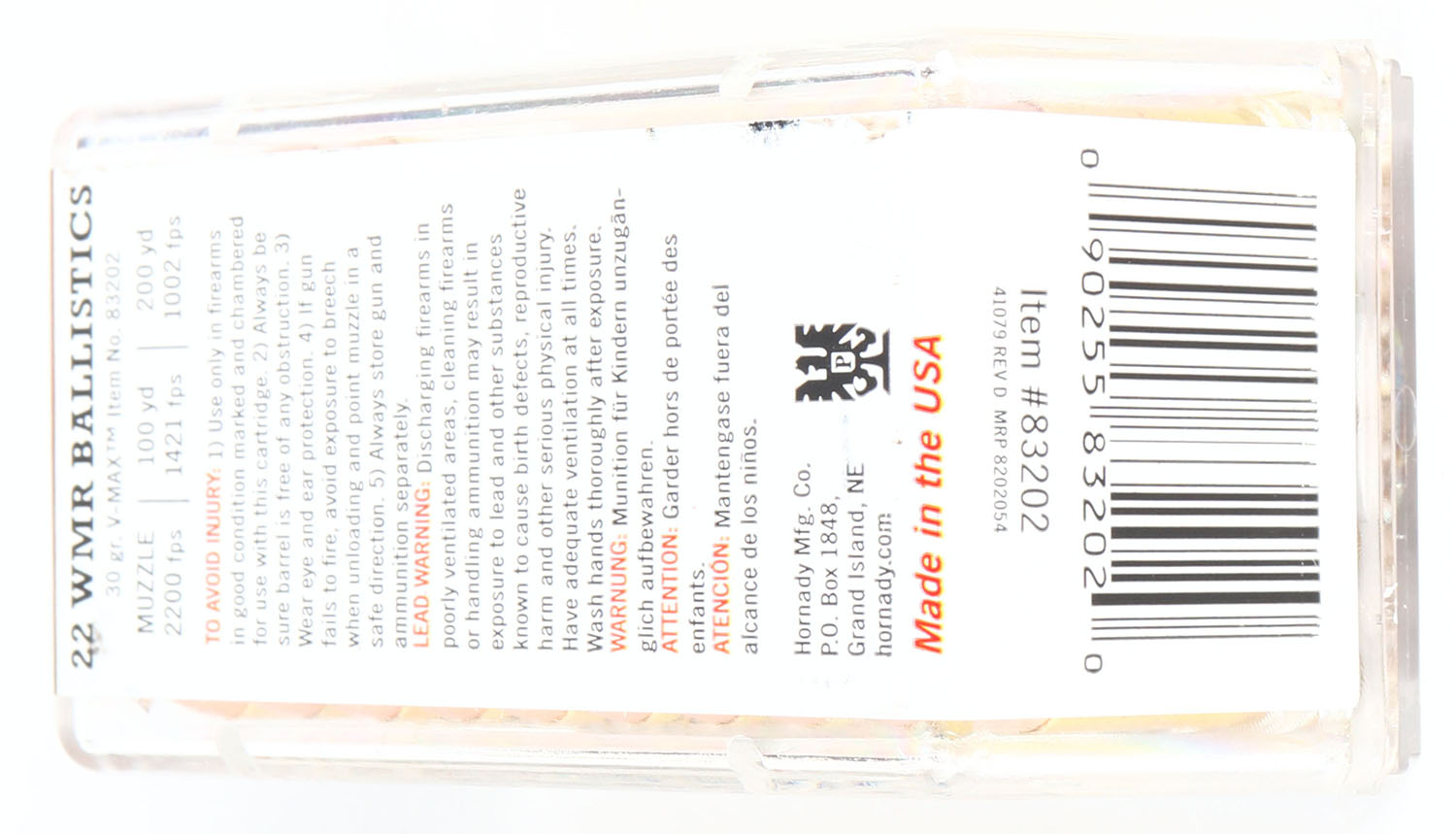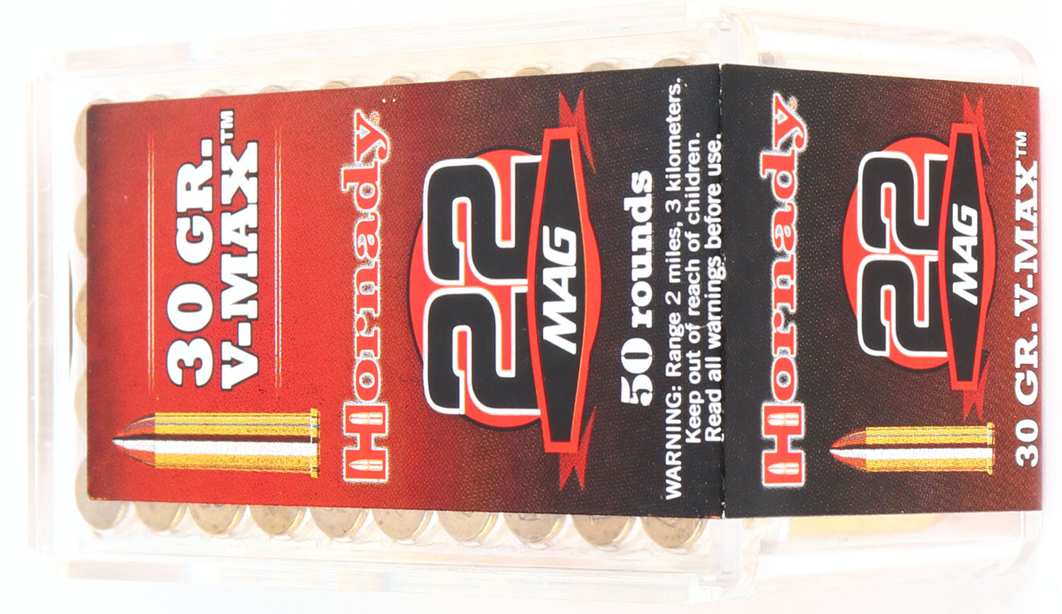Hornady, .22 Mag, 30 Gr. V-Max, 2200 FPS, FULL & SEALED, 2pc. Clear plastic tray with red & black sealing label, box is MINT with mint color, label is mint, ammo appears mint. Grade: MINT - Value: 16 to 32