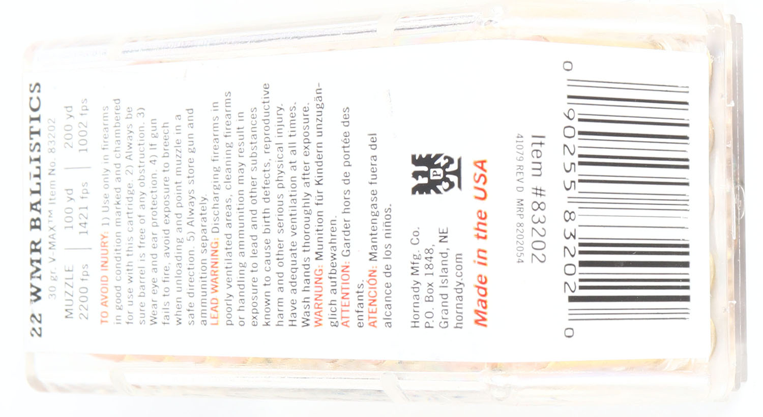 Hornady, .22 Mag, 30 Gr. V-Max, 2200 FPS, FULL & SEALED, 2pc. Clear plastic tray with red & black sealing label, box is MINT with mint color, label is mint, ammo appears mint. Grade: MINT - Value: 16 to 32