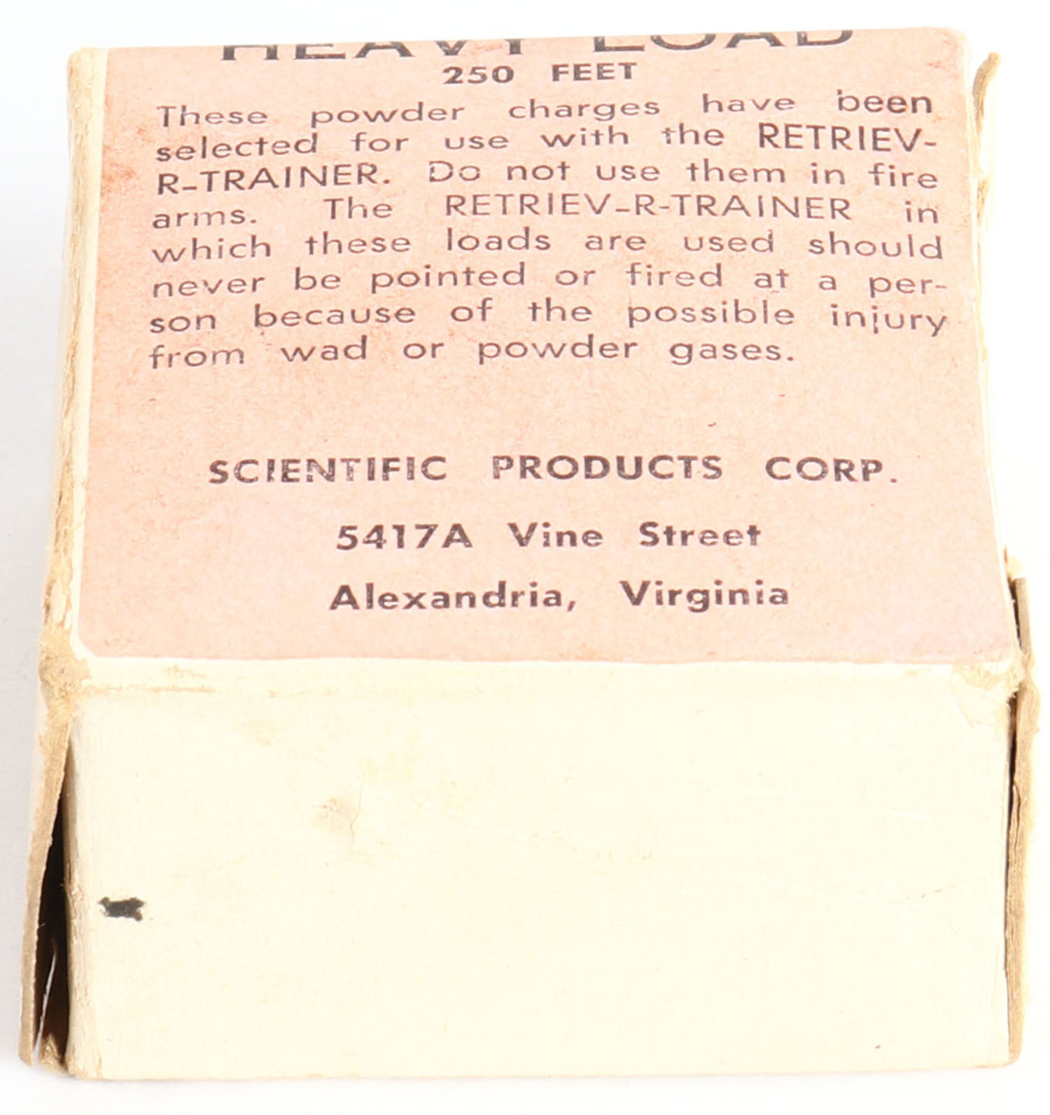 Scientific Products Corp., .22 Caliber Heavy Load, Full, 1pc. White box with salmon label, box is solid with very good color, some age soiling, minor corner wear, edges are mostly sharp, end flaps are solid, ammo is minty. Grade: Excellent - Value: 10 to 60