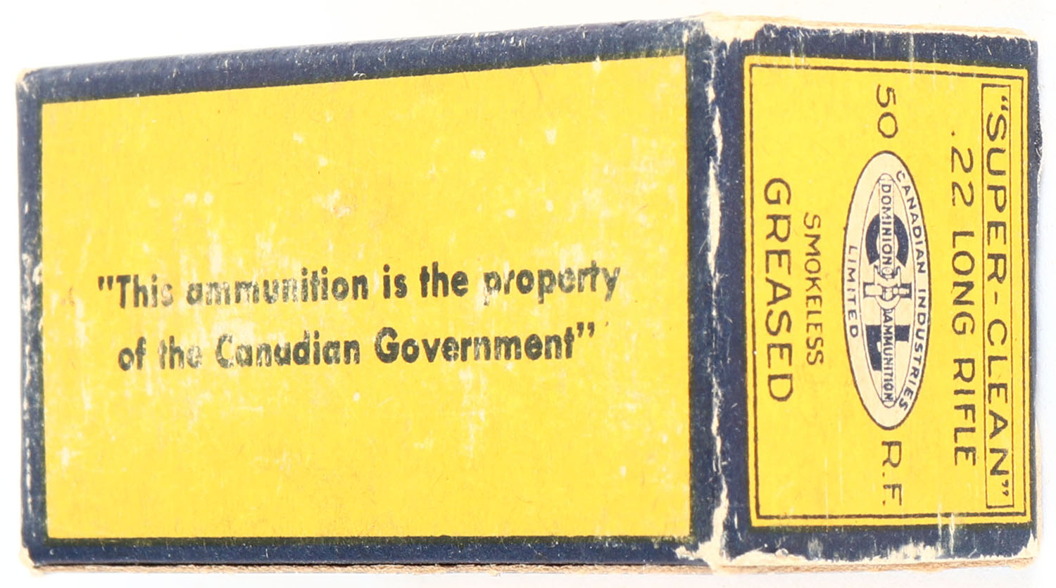 C.I.L., Super-Clean, .22 Long Rifle, Smokeless Greased, RHWeb: CIL-2 LR-1c, Full, 1pc. Yellow & blue box, box is solid with excellent color, very minor age soiling, very minor edge & corner wear, end flaps are solid, ammo is very good. Grade: Excellent + - Value: 8 to 40