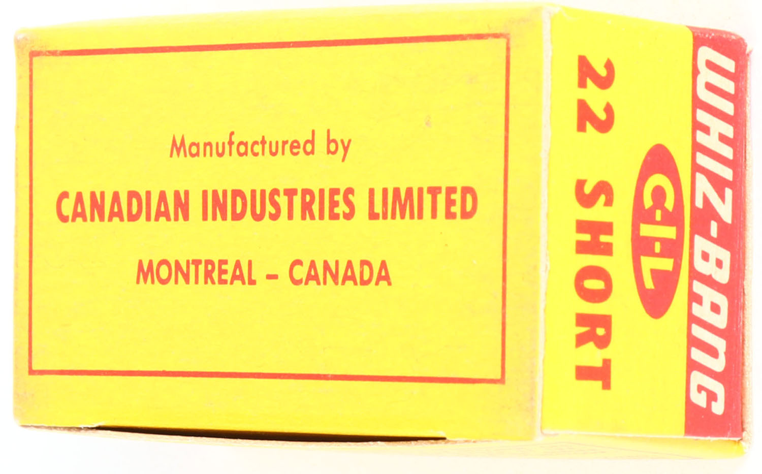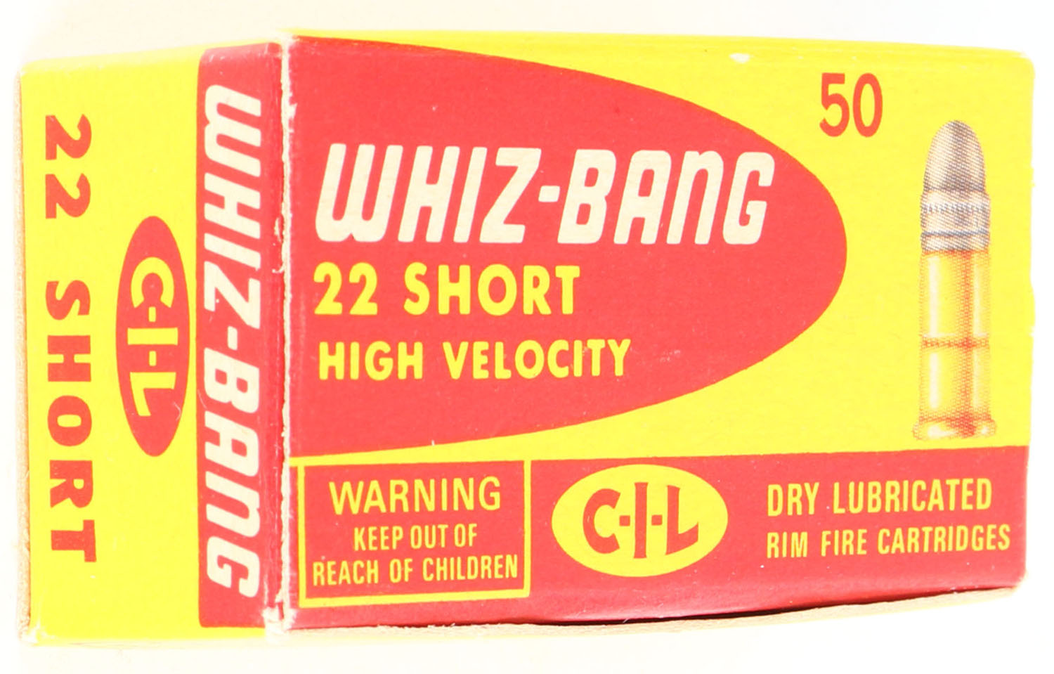 C.I.L., Whiz-Bang, 22 Short, High Velocity, Dry Lubricated, 1pc, Full, RHWeb: CIL-6 S-1, yellow and red box, box is near mint with minty color, only very minor corner wear, edges are crisp, top flap is solid, ammo is minty. Grade: Excellent ++ - Value: 10 to 50