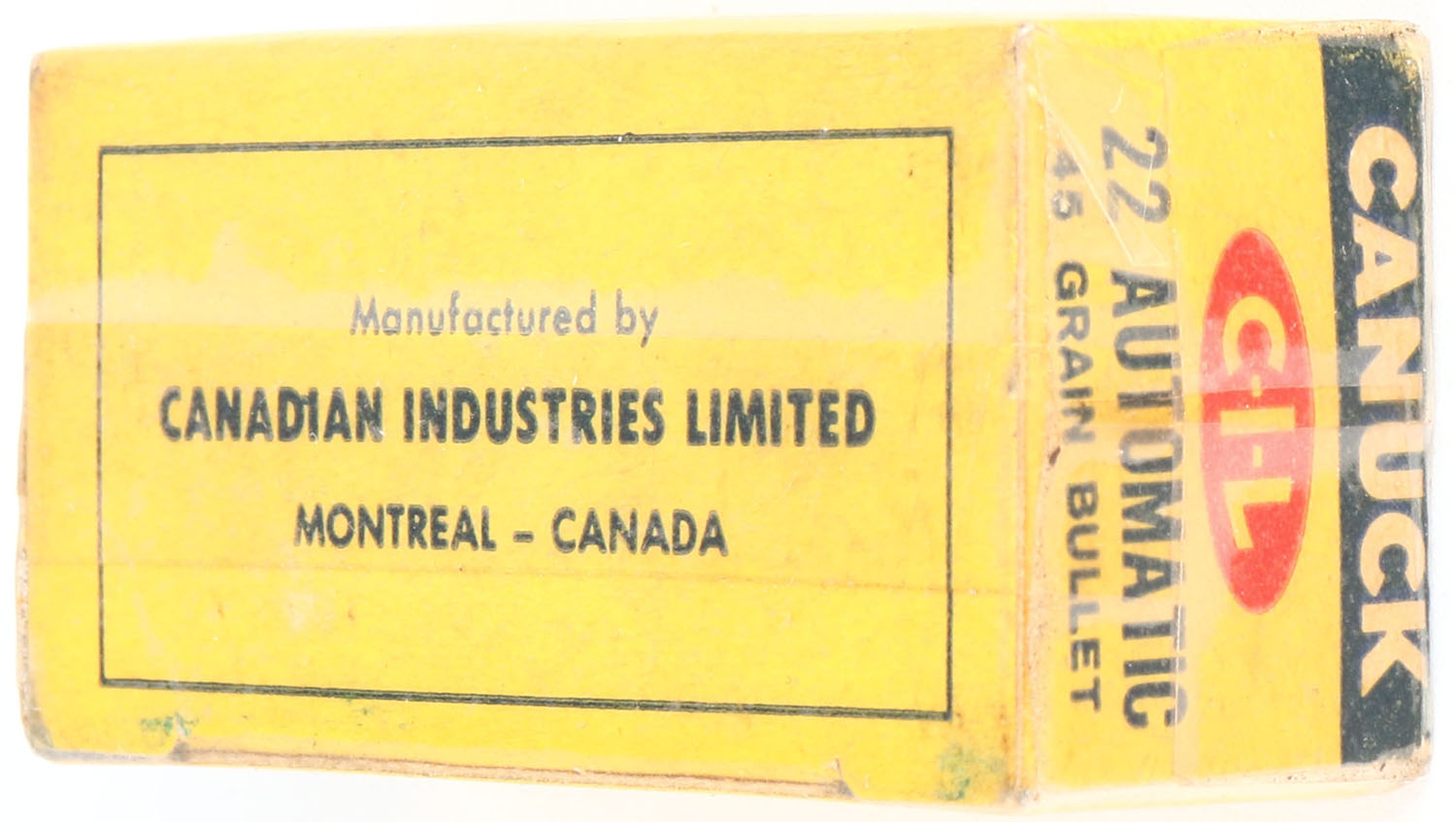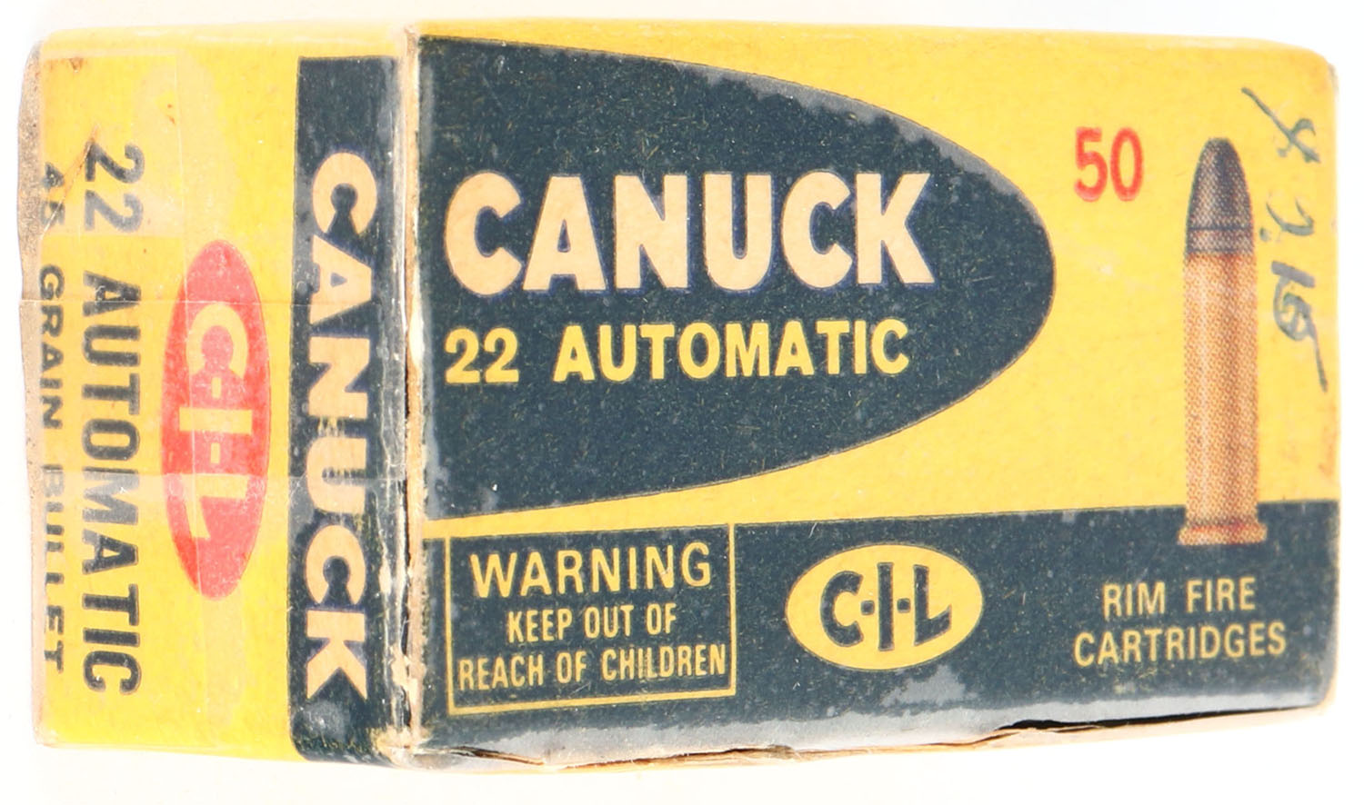 C.I.L., Canuck, .22 Automatic, 45 Grain Bullet, RHWeb: CIL-6 WA-1, Full, 1pc. Yellow & blue box, box is solid with excellent color, box is covered in clear tape, corners are mostly sharp, edges are crisp, top flap is solid, top has been written on, ammo is minty. Grade: Very Good ++ - Value: 20 to 80