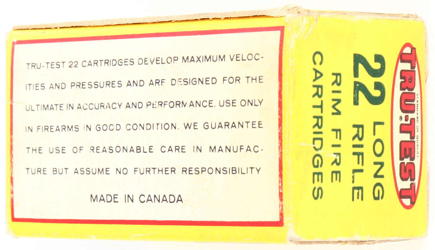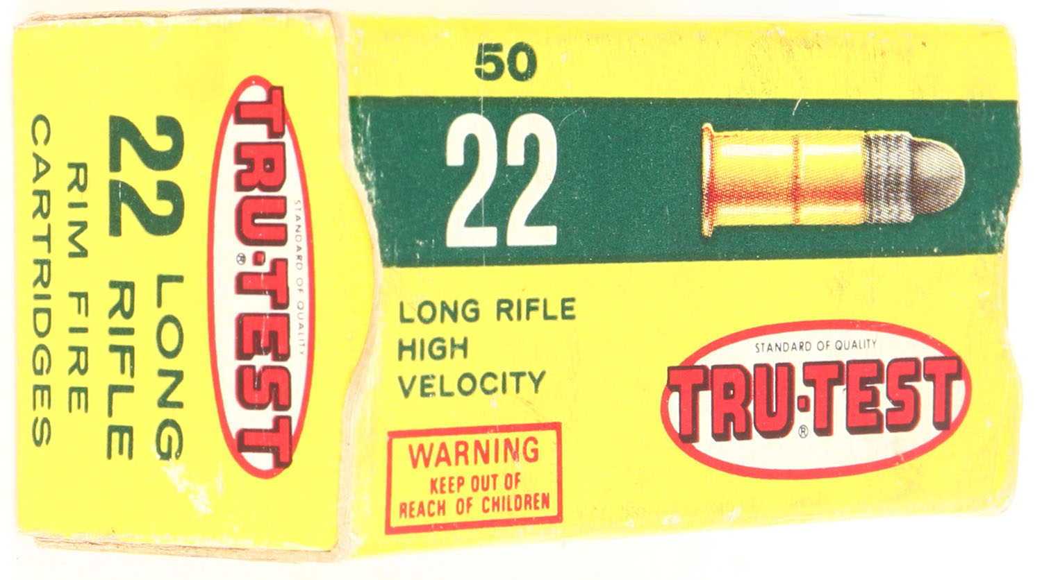 TruValue, Tru-Test, .22 Long Rifle, High Velocity, RHWeb: TT-2 LR-1a, Full, 1pc. Yellow green & red box, box is solid with excellent color, some shelf wear, minor corner wear, very minor edge wear, end flapps are solid, ammo is excellent. Grade: Excellent - Value: 6 to 30