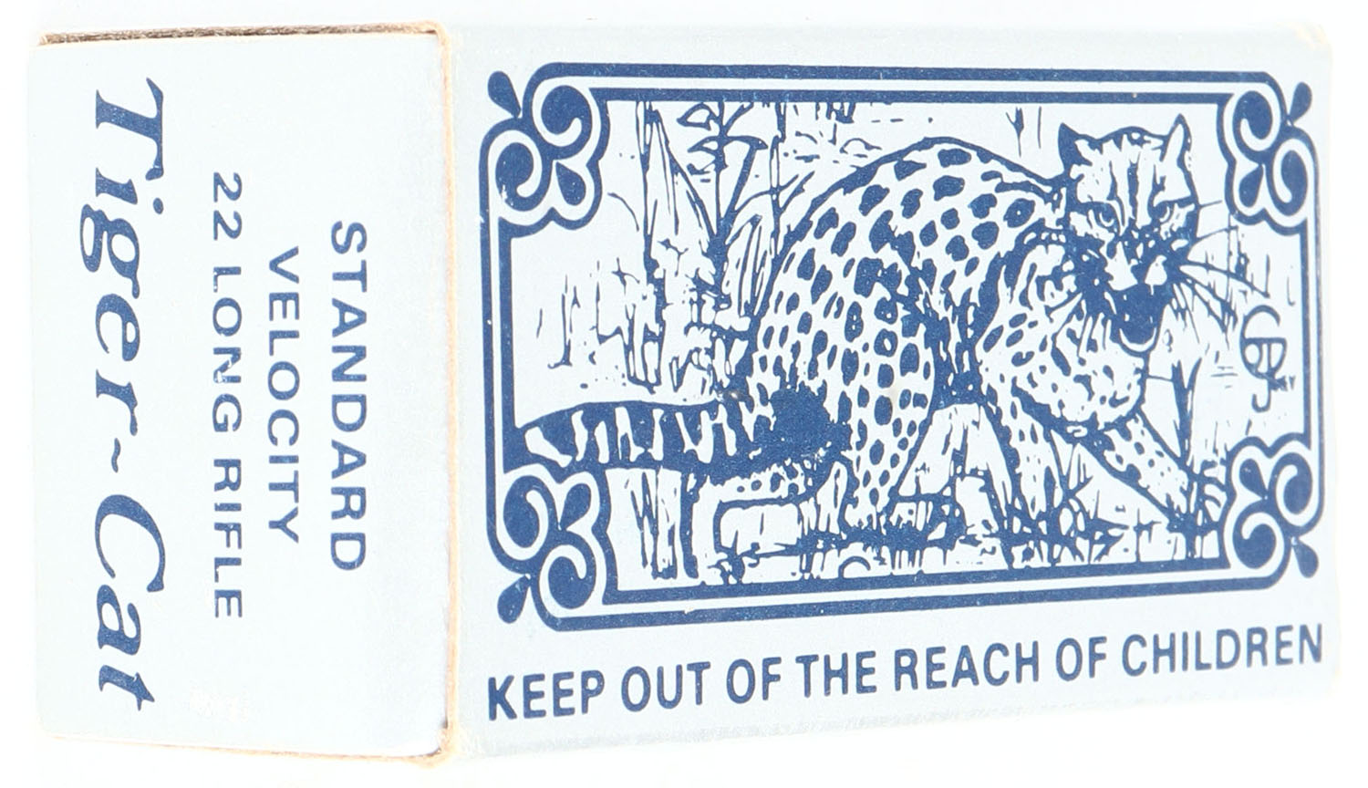 Sovereign, Tiger-Cat, .22 Long Rifle, Standard Velocity, RHWeb: SGD-1 LR-3, Full, 1pc. Silver & blue box, box is solid with minty color, very minor corner wear, edges are crisp, end flaps are solid, ammo is excellent. Grade: Excellent ++ - Value: 10 to 40