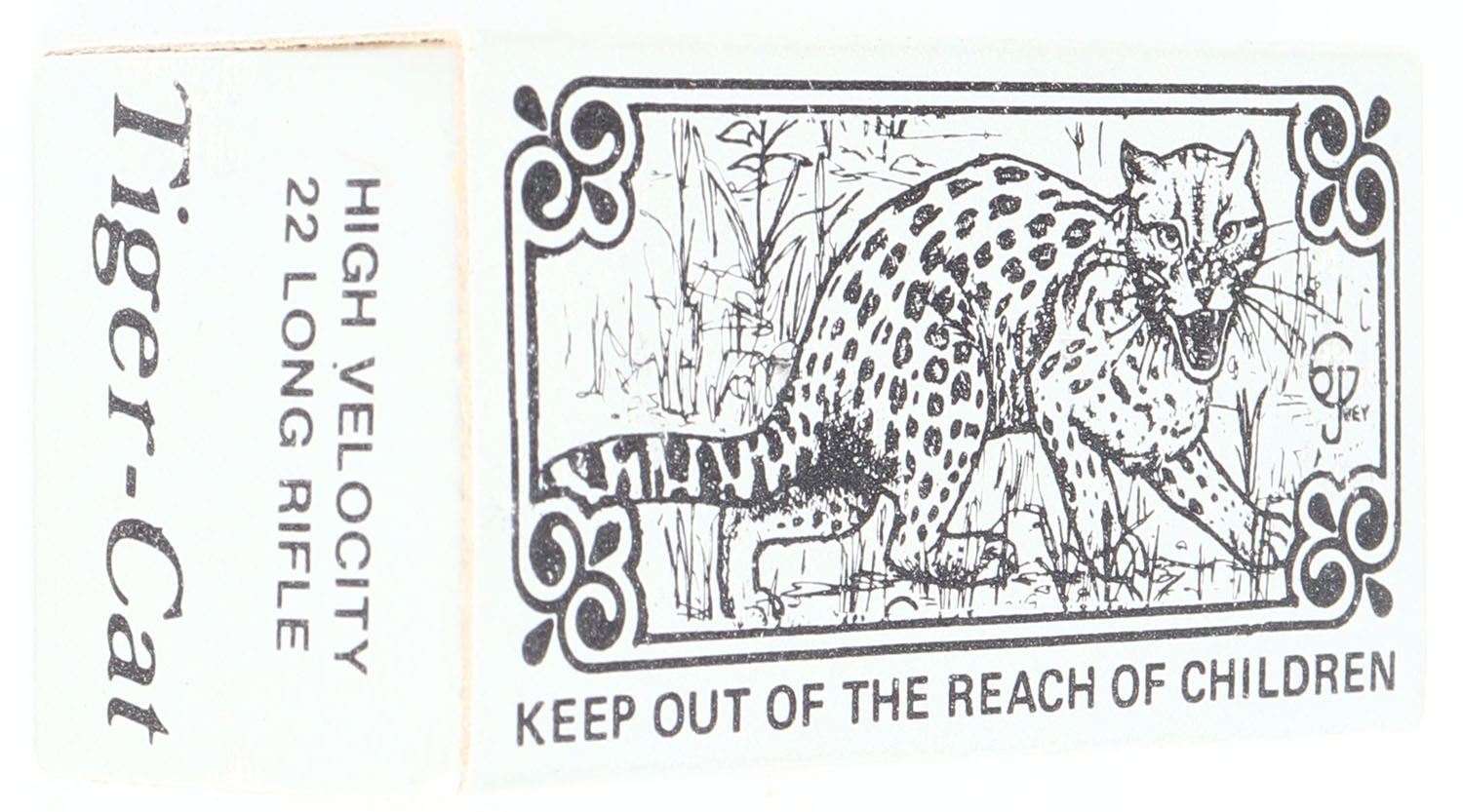 Sovereign, Tiger-Cat, .22 Long Rifle, High Velocity, RHWeb: SGD-1 LR-1a, Full, 1pc. Silver & black box, box is near mint with minty color, only very minor shelf wear, corners are sharp, edges are crisp, end flaps are solid, ammo is excellent. Grade: Excellent ++ - Value: 10 to 40