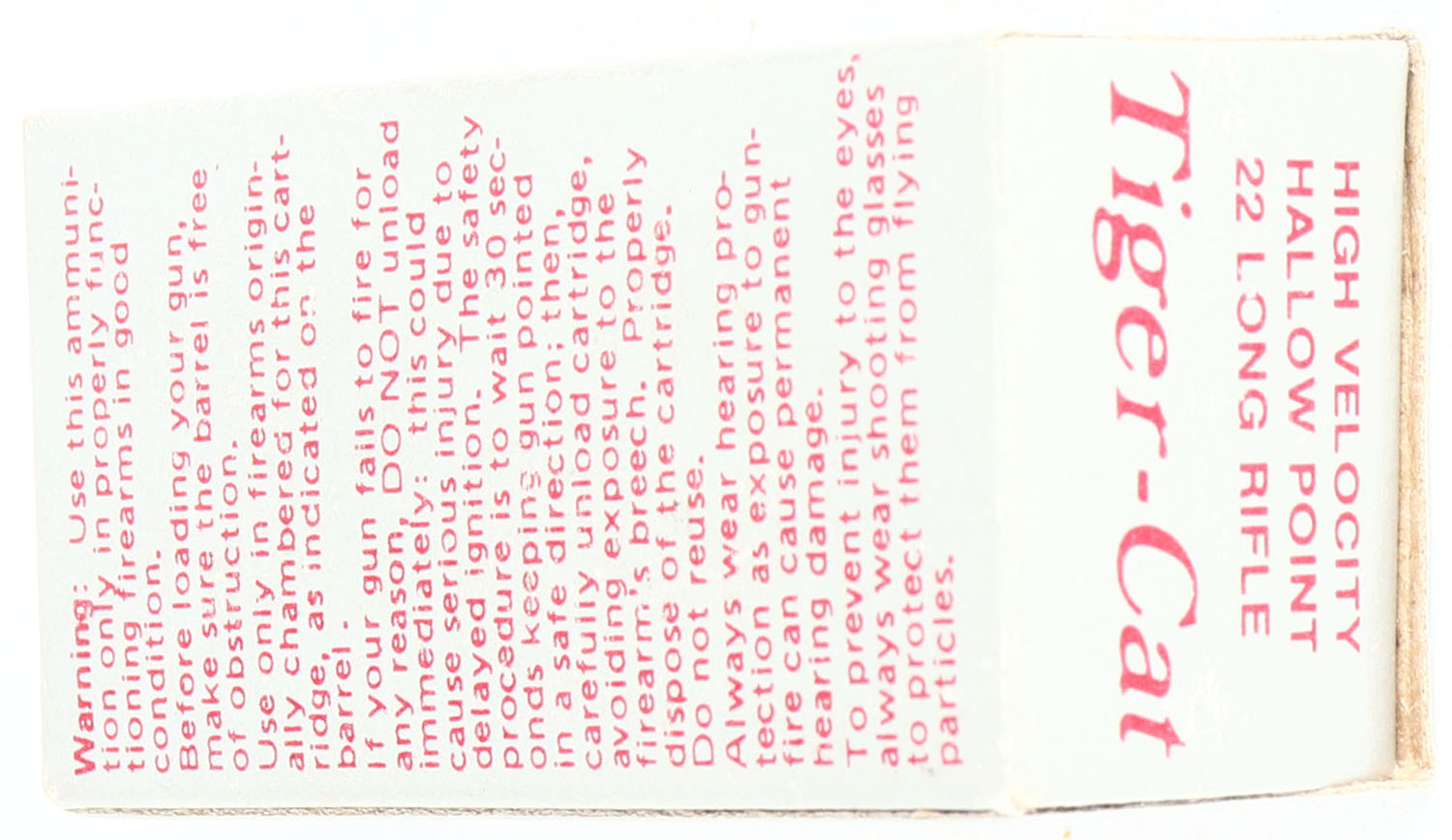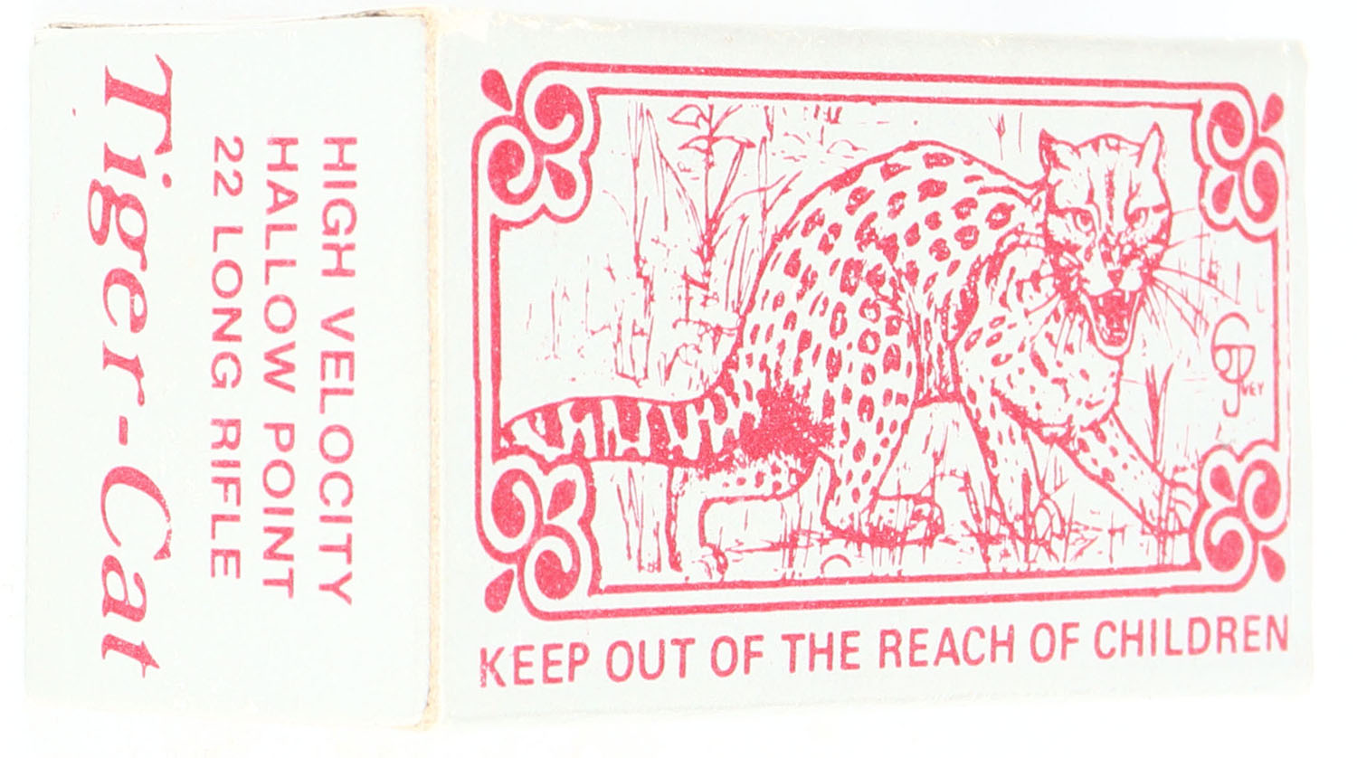 Sovereign, Tiger-Cat, .22 Long Rifle Hollow Point (Mis-Spelled as ''Hallow Point'') RHWeb: SGD-1 LR-2.1, Full, 1pc. Silver & red box, box is solid with excellent to minty color, very minor shelf wear, corners are mostly sharp, edges are crisp, end flaps are solid, ammo is excellent. Grade: Excellent ++ - Value: 10 to 40