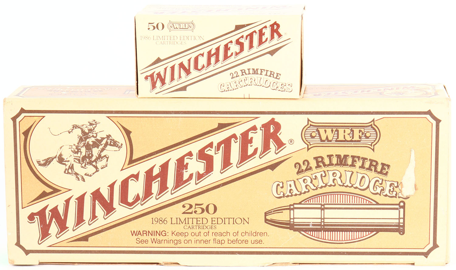 Winchester, .22 WRF, 1986 Limited Edition, Full, 250rds. 1pc. Brown & tan brick, brick is solid with minty color, only very slight wear near the front flap insert, very minor corner wear, edges are crisp, top flap is rigid, inside boxes are mint. Grade: Excellent ++ - Value: 50 to 100