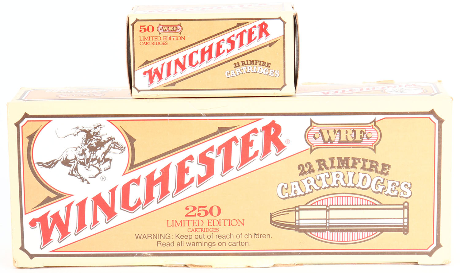 Winchester, .22 WRF, 1997 Limited Edition, Full, 250rds. 1pc. Brown & tan brick, brick is solid with very good to excellent color, some discoloration to front side and bottom, some wear at insert tab, corners are mostly sharp, edges are mostly crisp, top flap is solid, inside boxes are minty. Grade: Excellent - Value: 50 to 100