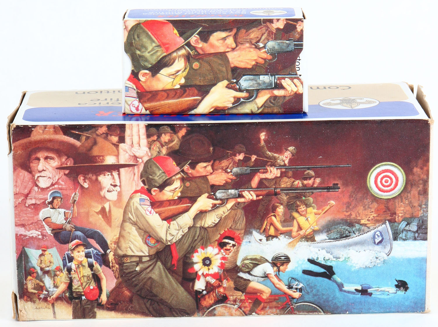 Winchester, Boy Scouts of America 75th Anniversary, .22 Long Rifle, High Velocity, Full 500rds. 1pc. multi colored brick featuring pictures of Boy Scouts, brick is solid with excellent to minty color, minor shelf & corner wear, edges are mostly crisp, end flaps are solid, inside boxes are excellent. Grade: Excellent + - Value: 100 to 200