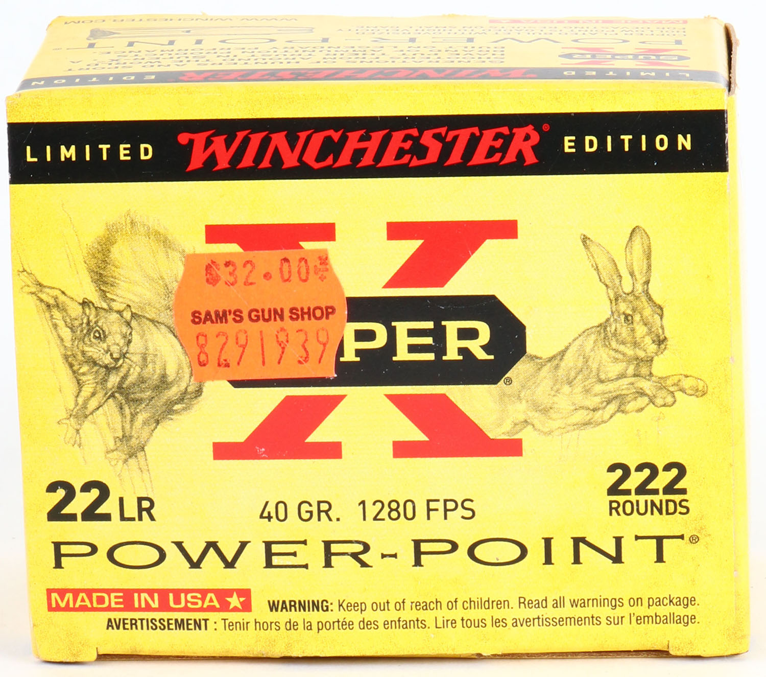 Winchester, Super X Power-Point, .22 Long Rifle, Full, 222rds. 1pc. Yellow black & red bulk box, box is MINT with minty color, corners are sharp, edges are crisp, top flap is solid, ammo is mint. Grade: MINT - Value: 10 to 50