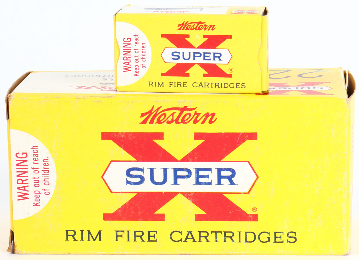 Western, Super X, .22 Long Rifle, 40 Gr. Lubaloy Coated Bullet, Full 500rds., 1pc. Yellow white & red brick, brick is solid with excellent color, some shelf wear, minor edge & corner wear, end flaps are solid, inside boxes are minty. Grade: Excellent - Value: 100 to 250