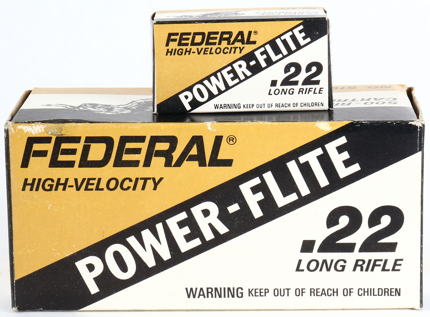 Federal, Power-Flite, .22 Long Rifle, Full 500rds., 1pc. Bronze white & black brick, brick is solid with excellent to minty color, some corner wear, very minor edge wear, end flaps are solid, inside boxes are mint. Grade: Excellent ++ - Value: 20 to 80
