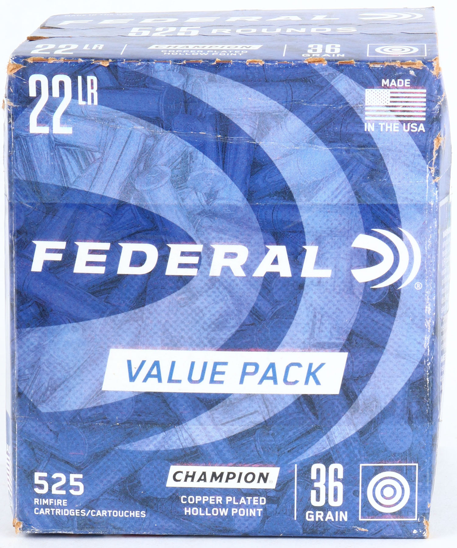 Federal, Value Pack, .22 Long Rifle Hollow Point, 36 Grain Copper Plated, 1260 FPS, FULL & SEALED, 525rds., 1pc. Blue & white bulk box, box is solid with minty color, minor edge & corner wear. Grade: Excellent - Value: 20 to 60