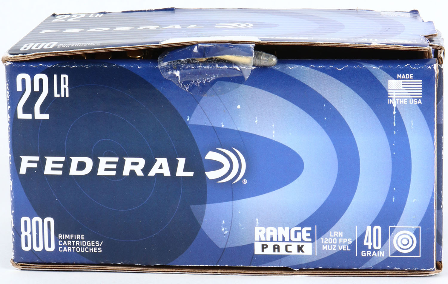 Federal, Range Pack, .22 Long Rifle, 40 Grain Lead Round Nose, 1200 FPS, Full 800 rds., 1pc. Blue bulk box, box is solid with minty color, some shelf wear, corners are sharp, edges are crisp, top flap is solid, ammo is minty. Grade: Excellent - Value: 40 to 80