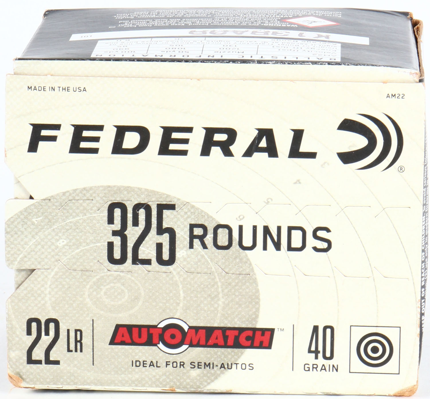 Federal, AutoMatch, .22 Long Rifle, Ideal for Semi-Autos, 40 Grain Solid, 1200 FPS, FULL & SEALED 325 rds. 1pc. Tan & black bulk box, box is solid with minty color, very minor corner wear, edges are crisp. Grade: Excellent ++ - Value: 20 to 40
