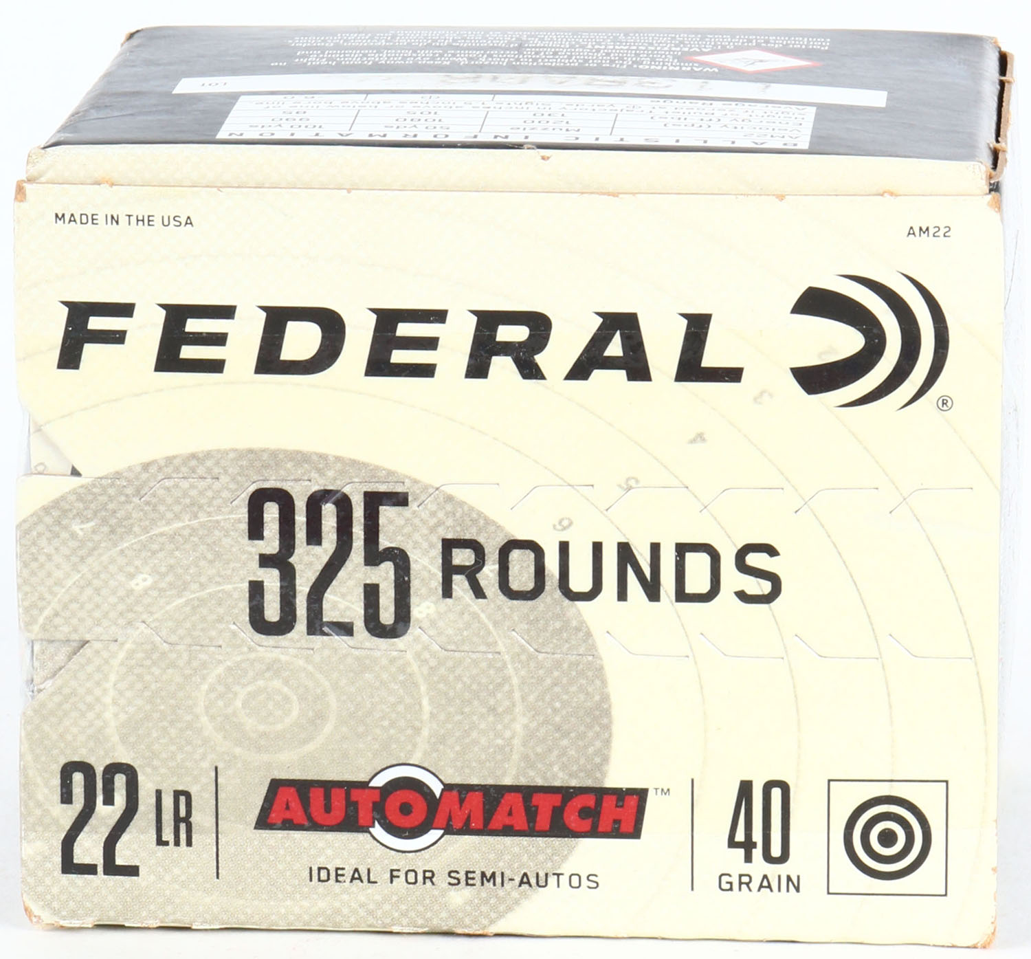 Federal, AutoMatch, .22 Long Rifle, Ideal for Semi-Autos, 40 Grain Solid, 1200 FPS, FULL & SEALED 325 rds. 1pc. Tan & black bulk box, box is solid with minty color, very minor corner wear, edges are crisp. Grade: Excellent ++ - Value: 20 to 40