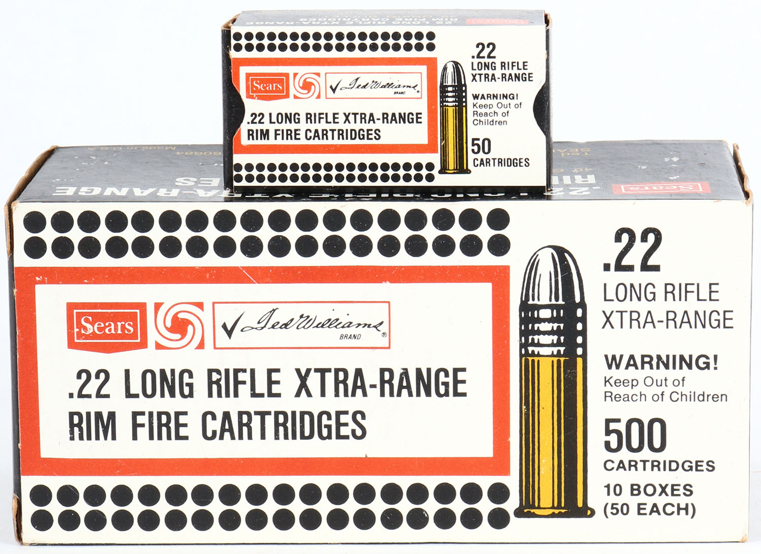 Sears, Ted Williams Xtra-Range, .22 Long Rifle, Full 500rds., 1pc. Black white & red brick, brick is solid with excellent to minty color, minor shelf wear, very minor corner wear, edges are crisp, end flaps are solid, inside boxes are minty. Grade: Excellent ++ - Value: 50 to 150
