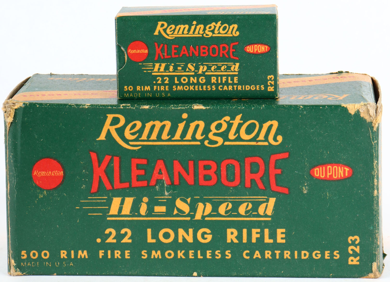 Remington, Kleanbore Hi-Speed, .22 Long Rifle Hollow Point, Full 500rds., 1pc. Green buff & red brick, brick is solid with excellent color, minor shelf wear, corner wear, very minor edge wear, end flaps are solid, inside boxes are mint. Grade: Very Good ++ - Value: 50 to 150