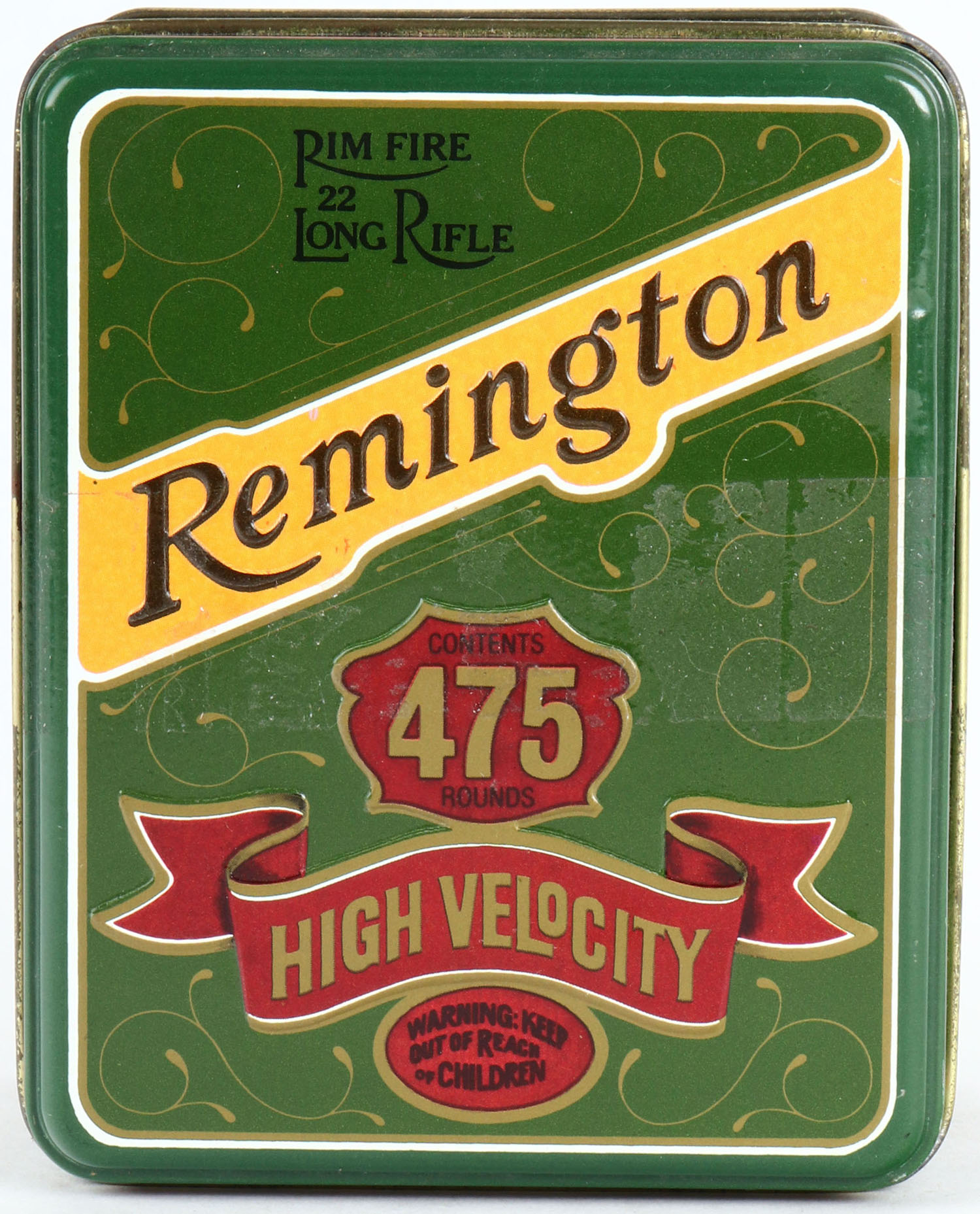 Remington, Kleanbore, .22 Long Rifle, High Velocity, 2pc. Full, 475rds. Collectors tin, pictures a factory on one side, green, red, yellow, black tin, color is minty, tape residue on lid and sides, ammo is excellent. Grade: Excellent - Value: 20 to 60