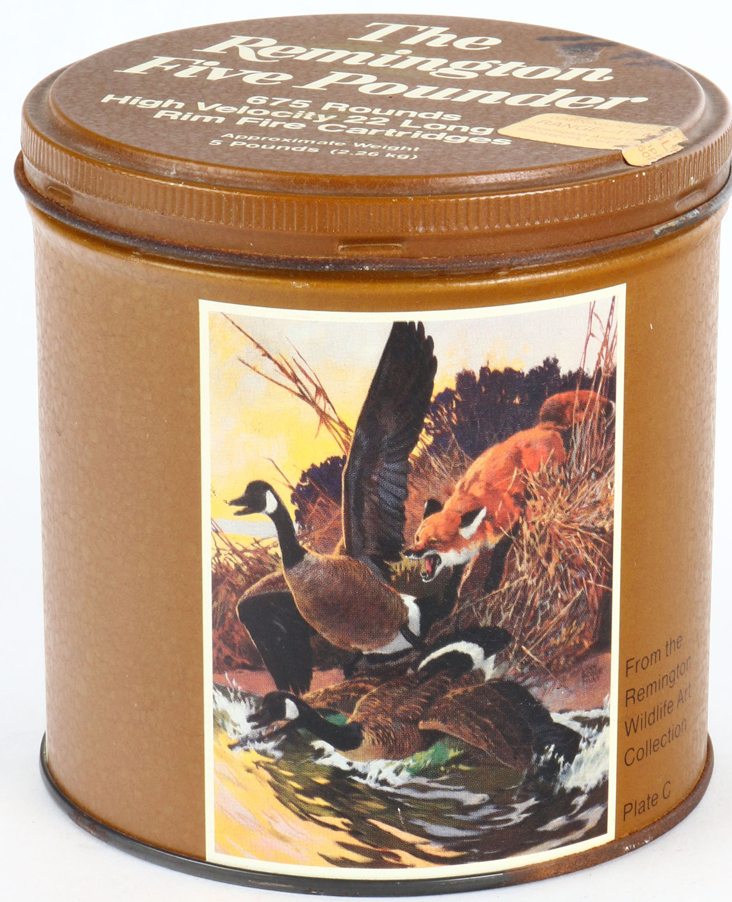 Remington, The Remington Five Pounder, .22 Long Rifle, High Velocity, Plate C, 2pc., Full, 675rds. collectors tin, tin is solid with excellent color, pictures 3 Remington Poster images on the side; ''Yukon Trouble'', ''The Right of Way'', and an image of a fox ambushing geese from the Remington Wildlife Art Collection, lid has been written on, ammo is excellent. Grade: Excellent - Value: 50 to 150